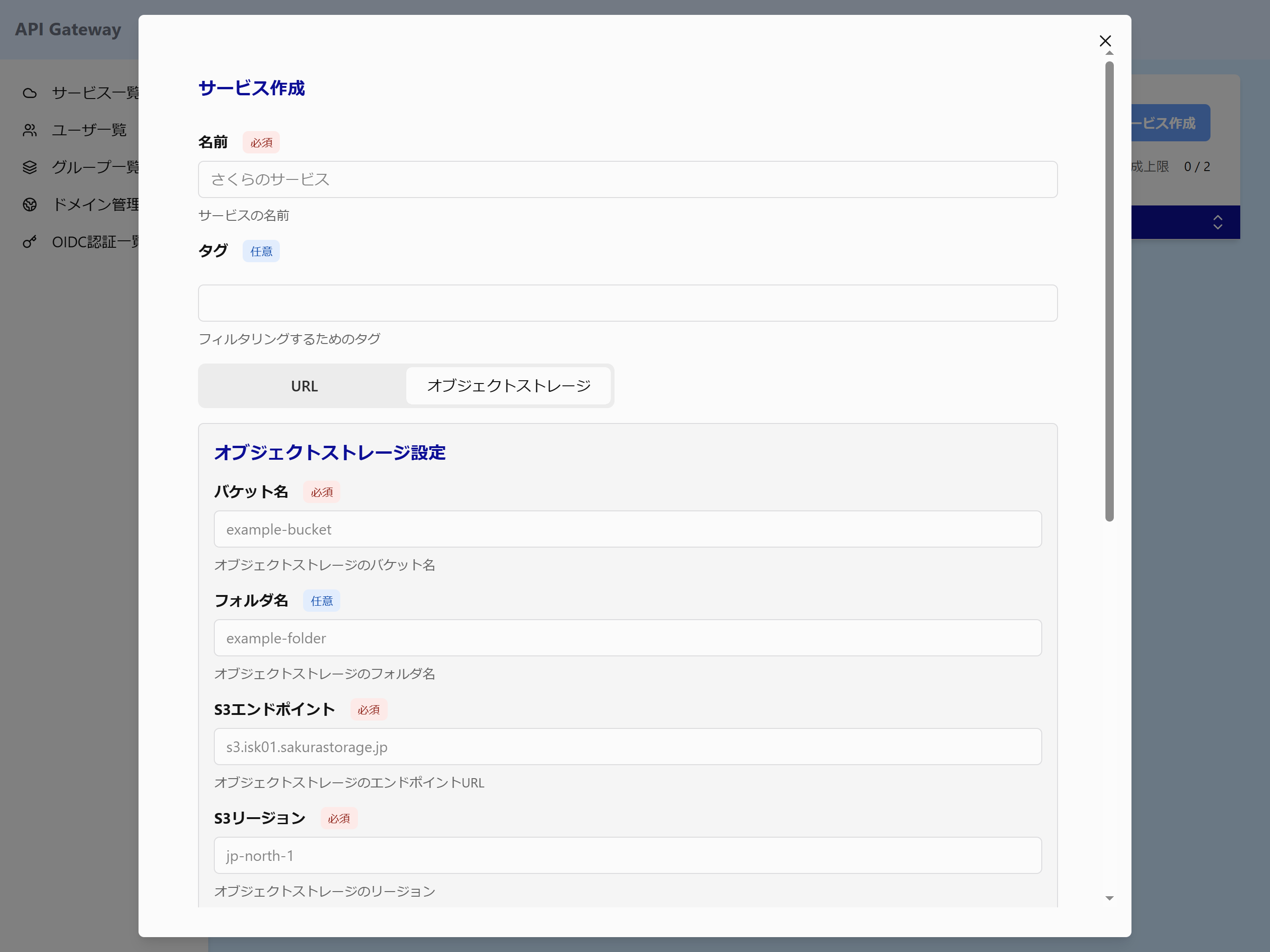 オブジェクトストレージのタブを押下します。 バックエンドサービスの情報を入力し、作成ボタンを押下するとサービスを作成することができます。