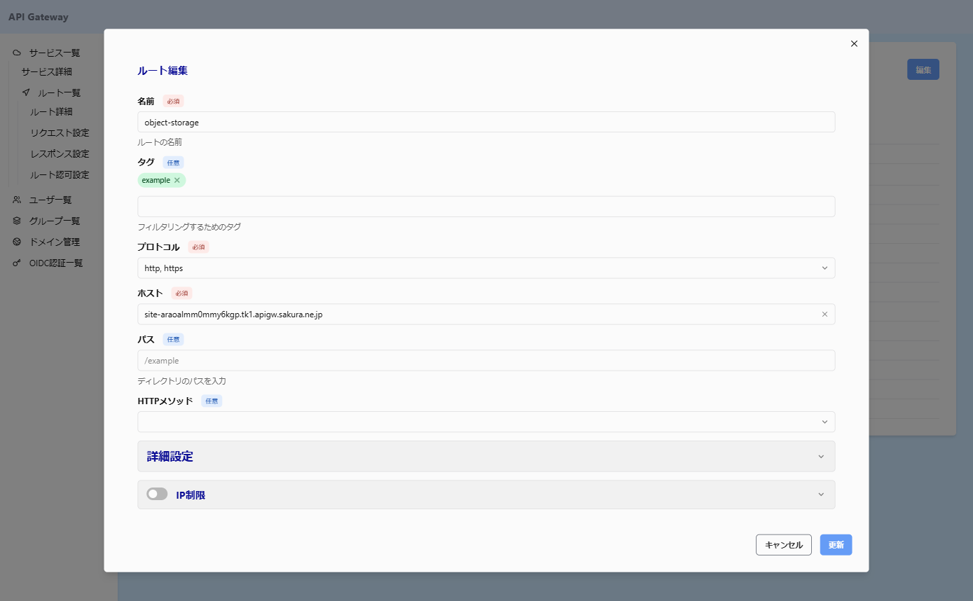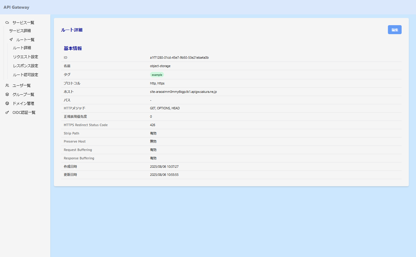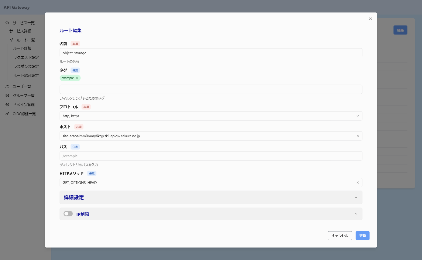 (サービスのフォルダ名を指定しない場合は、ルートのパスにオブジェクトストレージのフォルダ名を指定してください)作成したルートの設定も確認します。