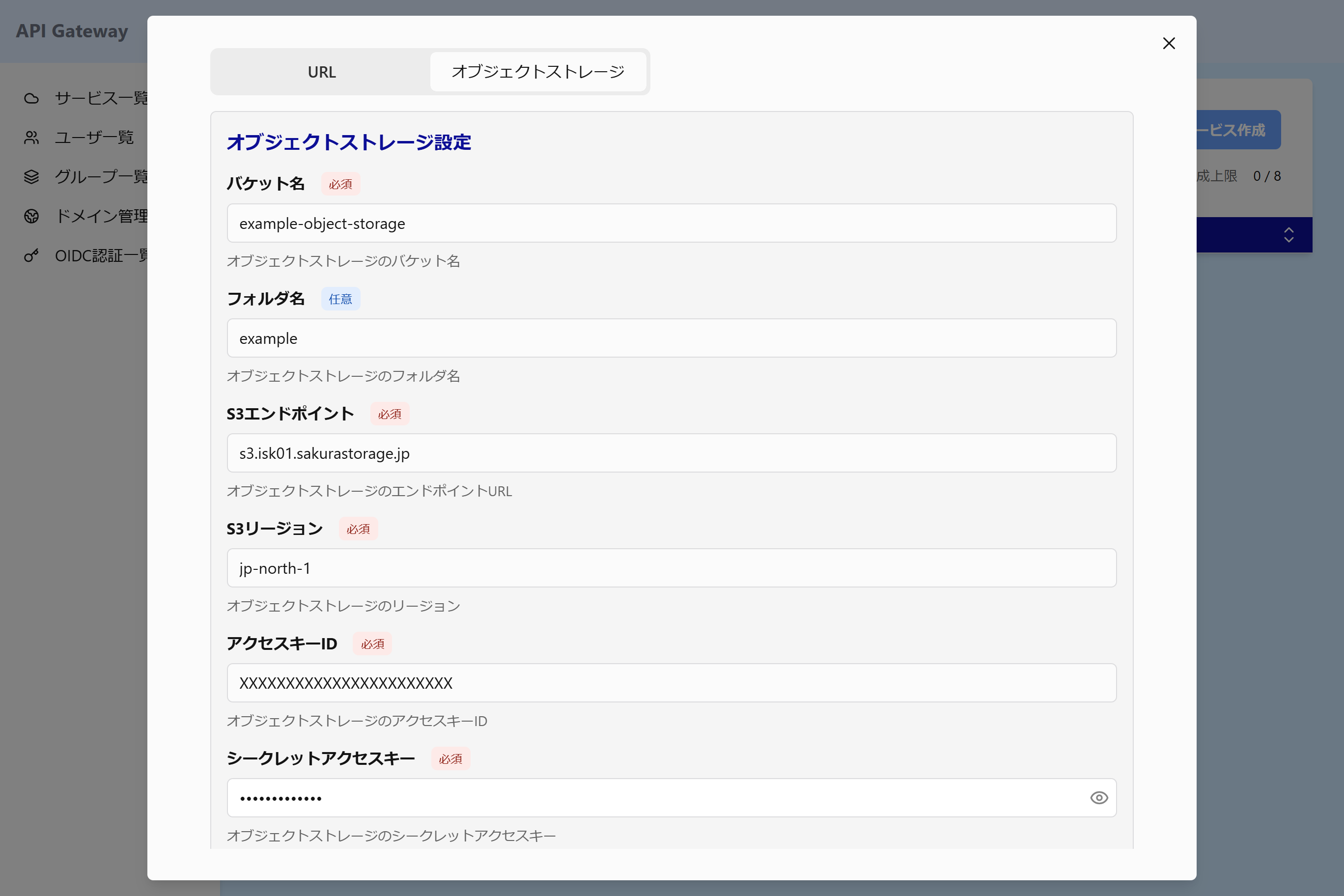 ※オブジェクトストレージのフォルダは「サービス側のフォルダ名」または「ルート側のパス」のどちらにも設定可能です。サービスが正しく登録されると、URLの項目にS3エンドポイント・バケット名・フォルダ名を組み合わせたURLが表示されます。