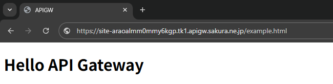 ルートのパスに「/」を設定した場合は、「ホストURL/資材名」にアクセスしてください。正常にアクセスできれば、アップロードした「example.html」が表示されます。