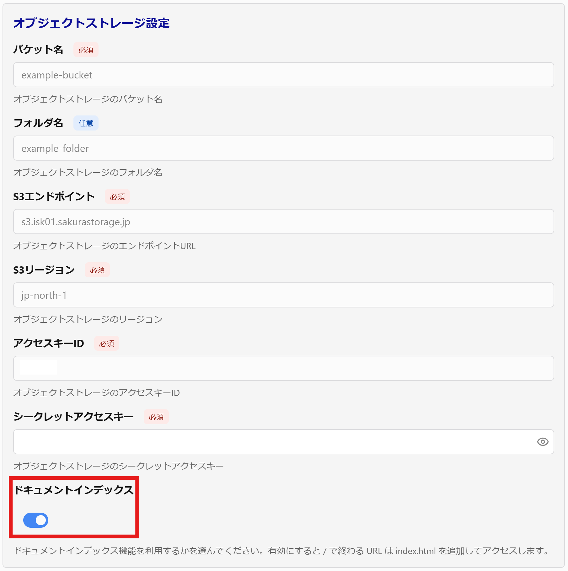 サービス作成時、用意したオブジェクトストレージの情報を登録します。
