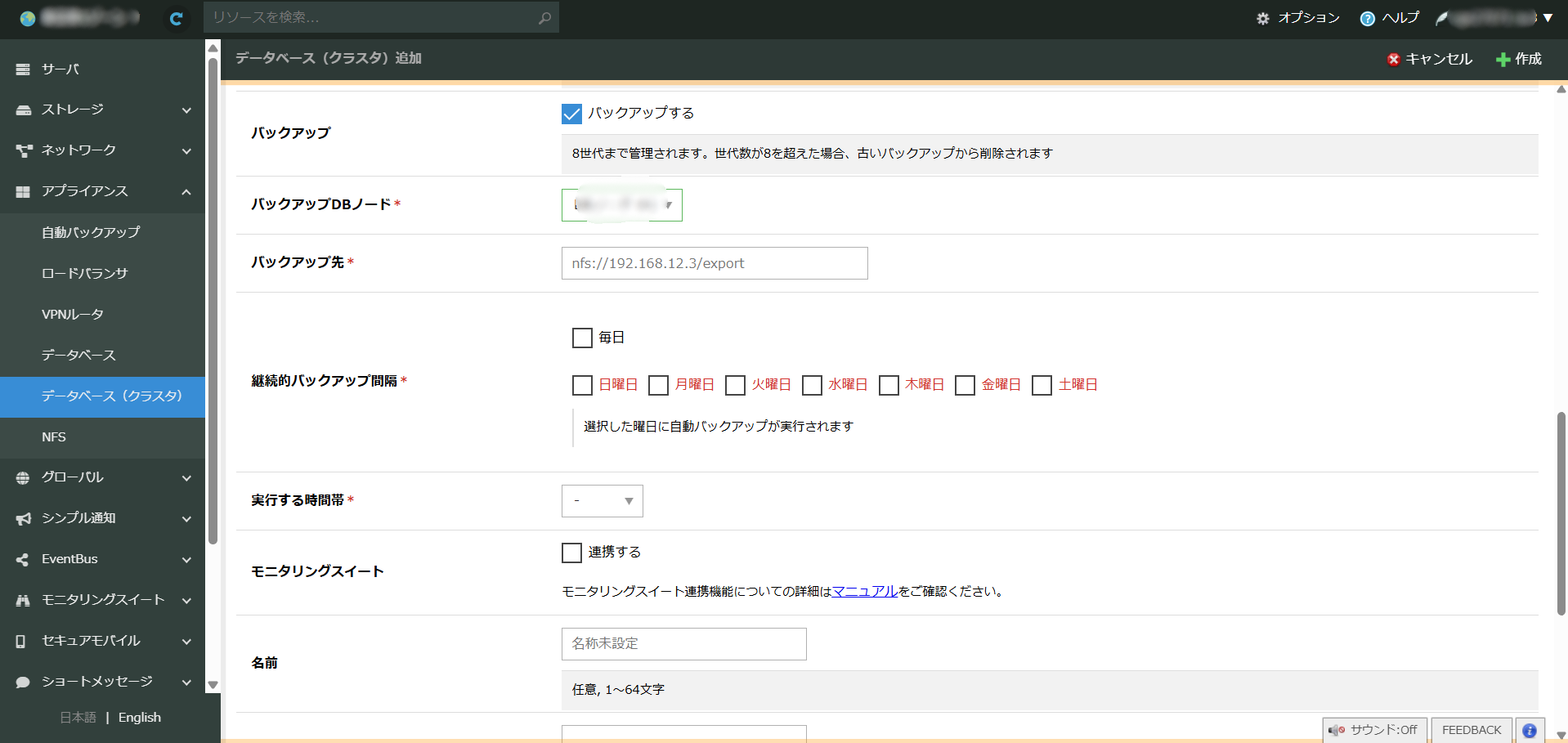 新規作成画面で「バックアップする」を選択していただくと、バックアップ先のNFSを指定するフィールドが表示されます。 バックアップの対象のノード、バックアップ先、バックアップ感覚、実行する時間帯を選択できます。