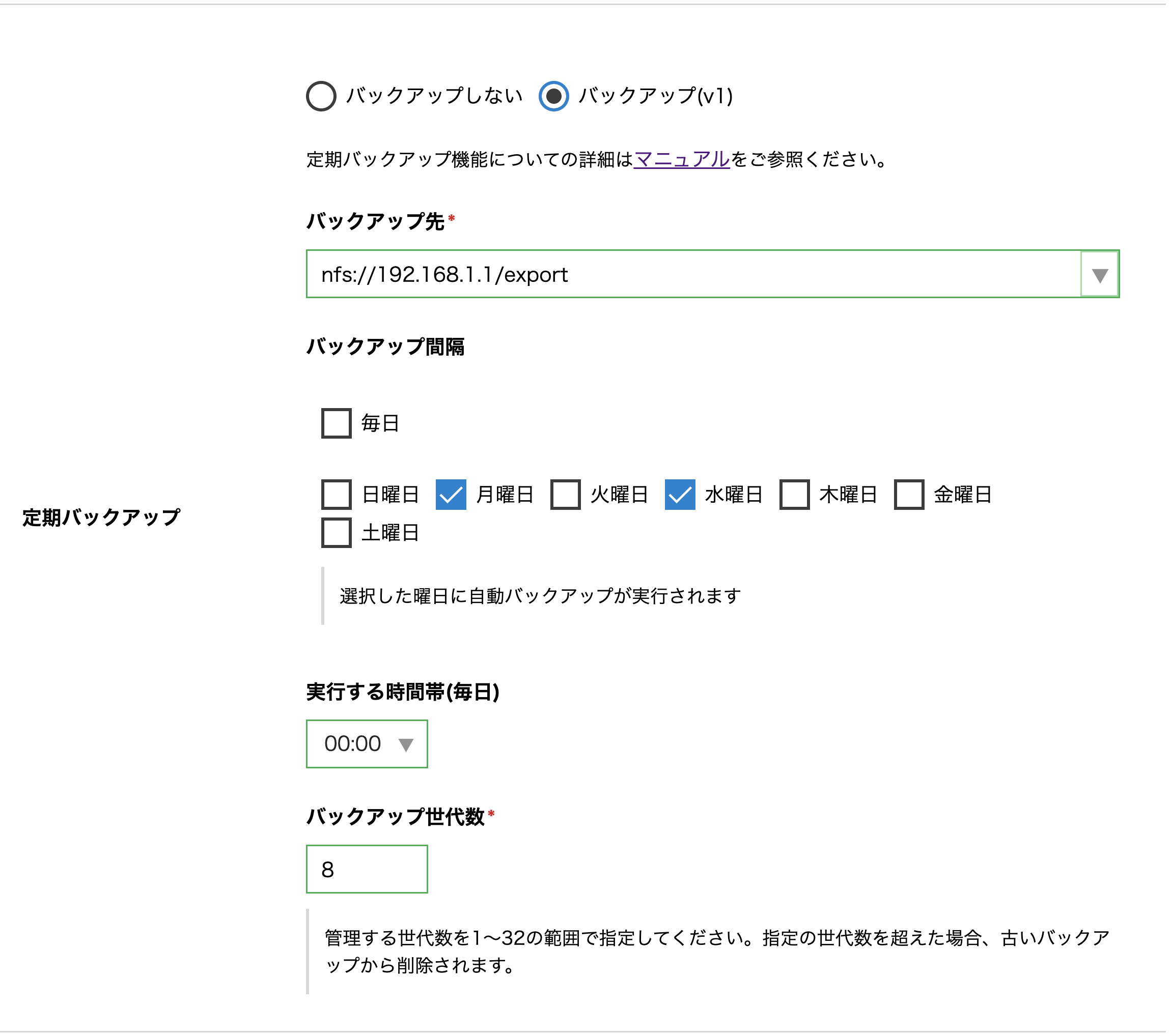 新規作成画面で「バックアップ(v1)」を選択していただくと、バックアップ先のNFSを指定するフィールドが表示されます。