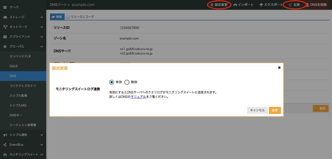 モニタリングスイートへのログの連携を有効化にするには、DNSアプライアンスの詳細画面にある「設定変更」をクリックし、表示される画面で有効化します。設定変更後は反映ボタンをクリックしてDNSサーバ側へ設定を反映します。