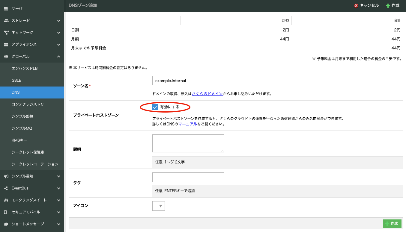 チェックを入れるとプライベートホストゾーンとして作成されます。 |