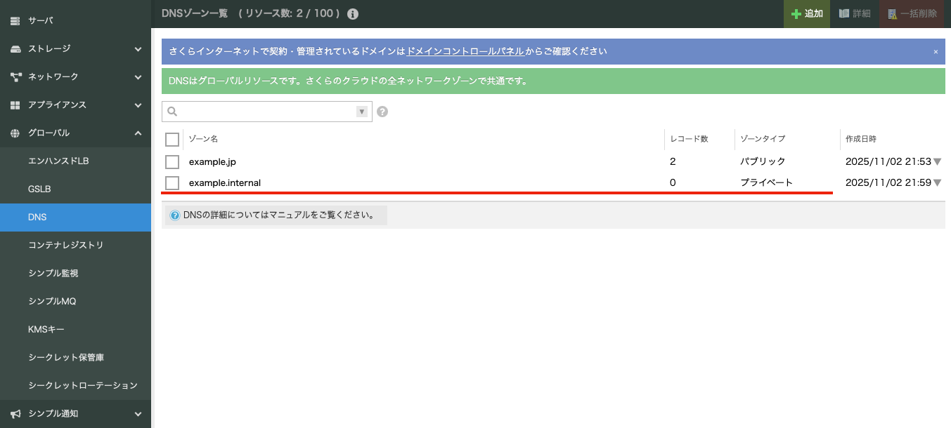 プライベートホストゾーン DNSサーバ(1)、および(2)には、DNSアプライアンスのゾーン詳細画面に表示されるDNSサーバのアドレスを指定します。