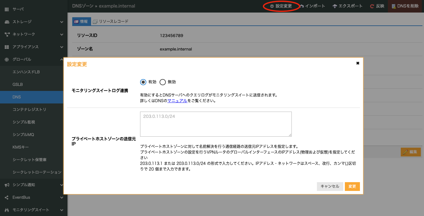 プライベートホストゾーンの送信元IPアドレスはDNSアプライアンスの詳細画面にある「設定変更」をクリックし、表示される画面で設定します。設定変更後は反映ボタンをクリックしてDNSサーバ側へ設定を反映します。