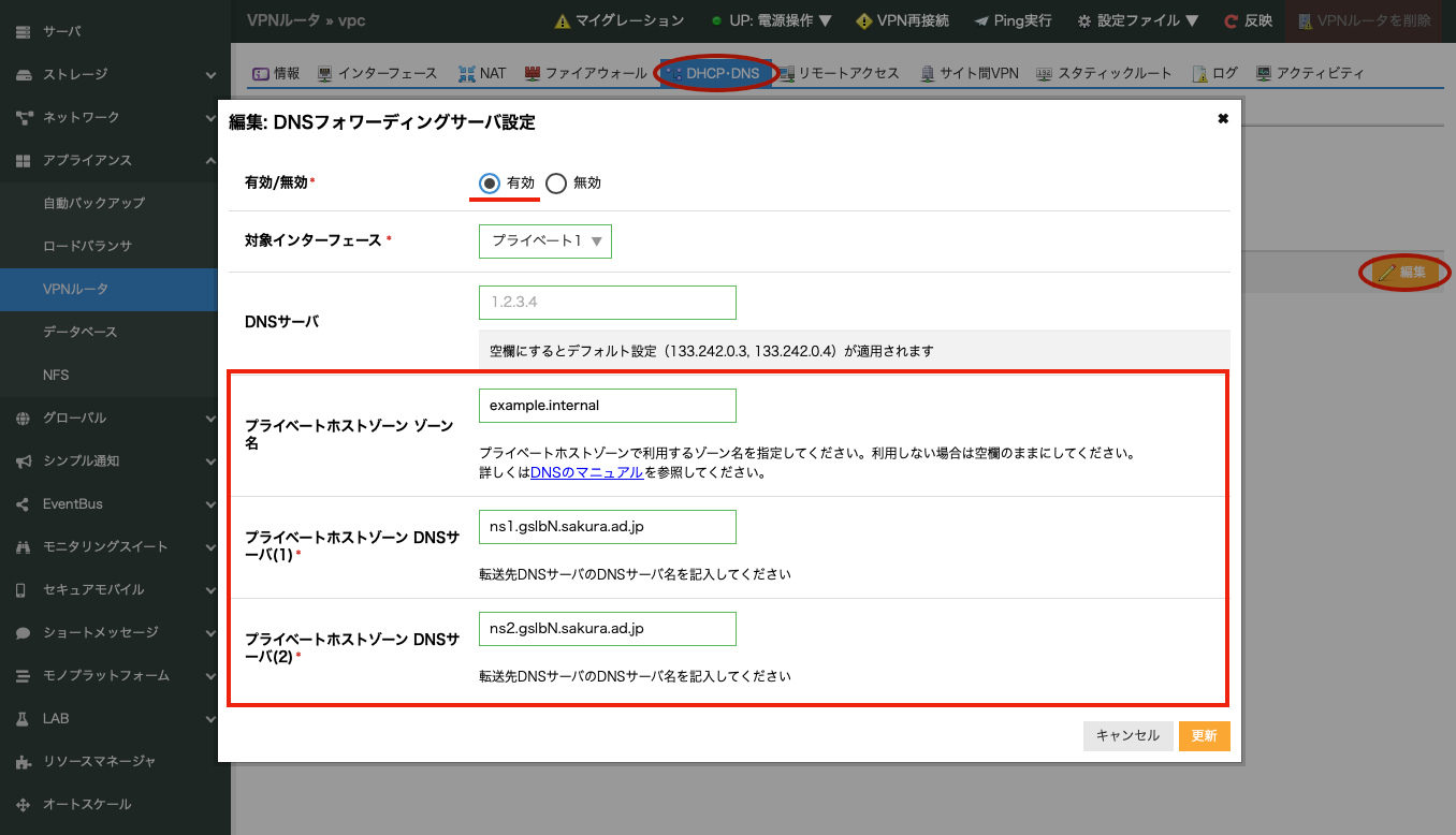 VPNルータのDHCP・DNSの設定メニューより、DNSフォワーディングサーバを選択し、編集画面でプライベートホストゾーンを指定します。設定変更後は反映ボタンをクリックしてVPNルータ側へ設定を反映します。