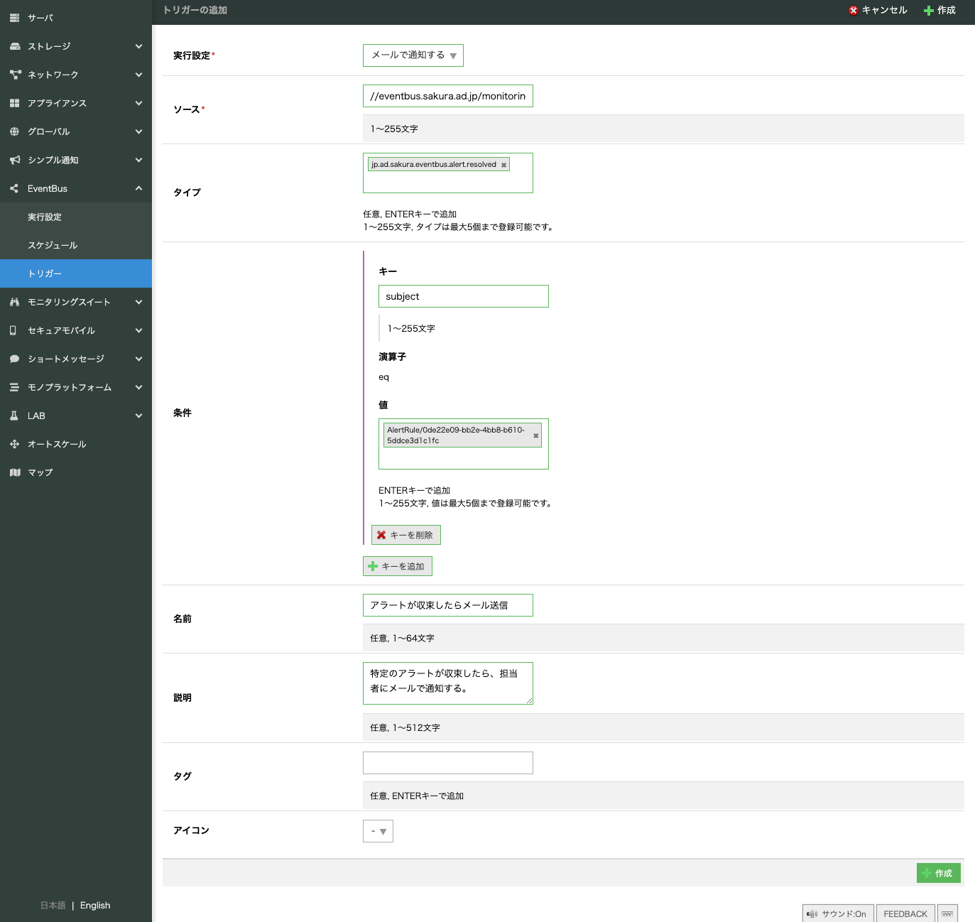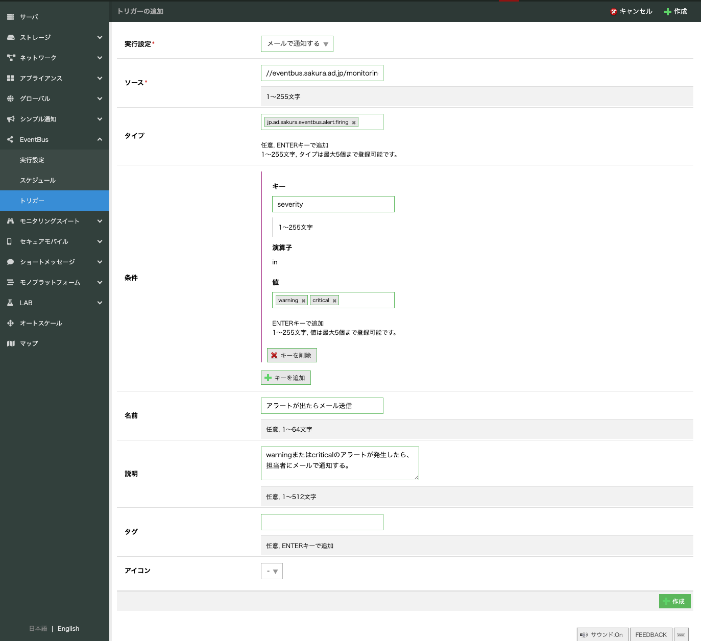ソースが「//eventbus.sakura.ad.jp/monitoringsuite/alert」(モニタリングスイートのAlert)の場合、設定できる(イベント)タイプは2つあります。