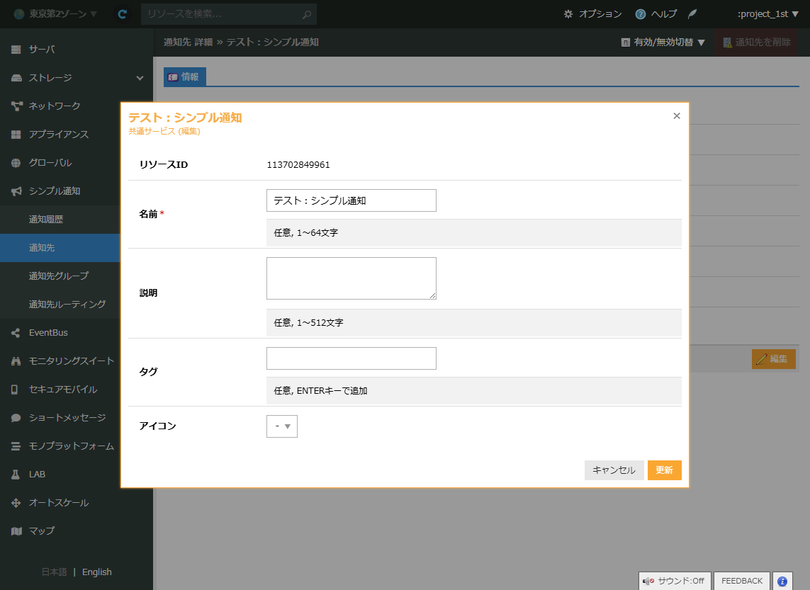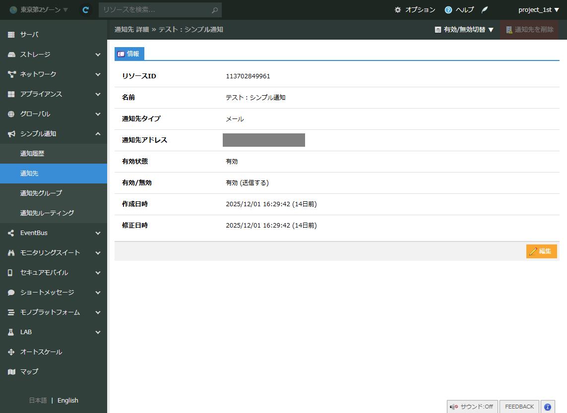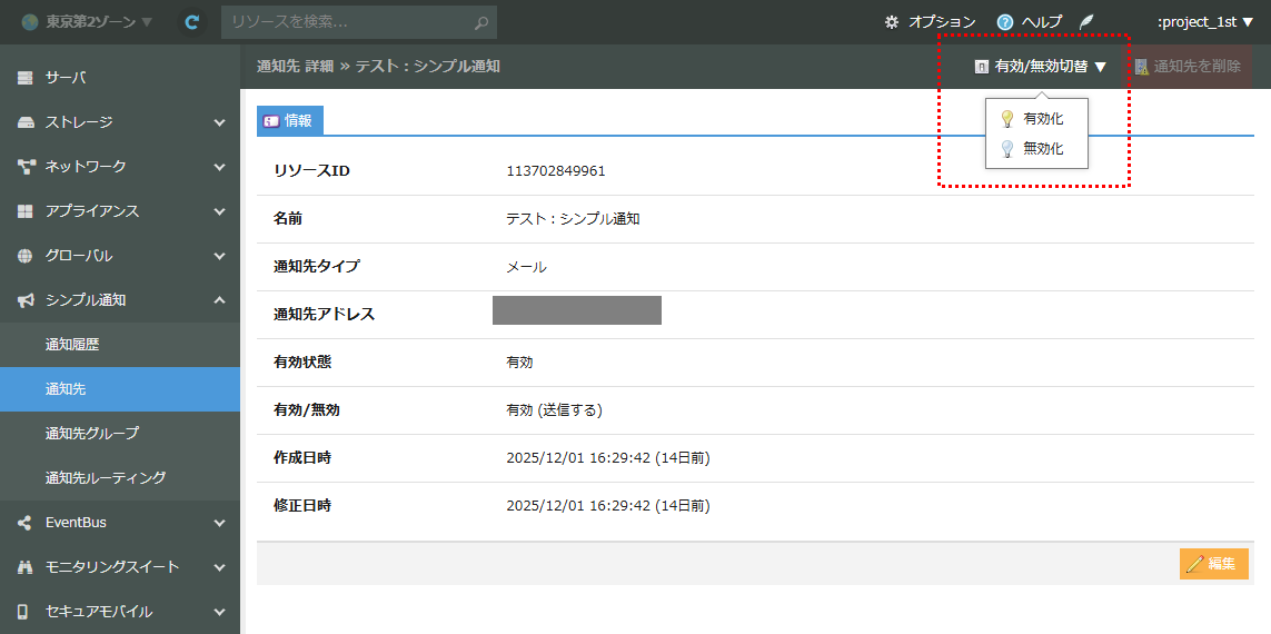 通知先設定の詳細画面で、右上の「有効/無効切替」> 「有効化」/「無効化」を選択