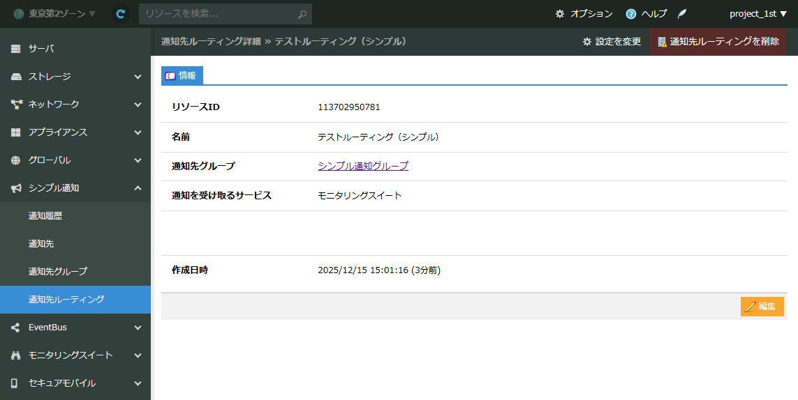 通知先ルーティング設定の詳細画面で、右上の「通知先ルーティングを削除」をクリック