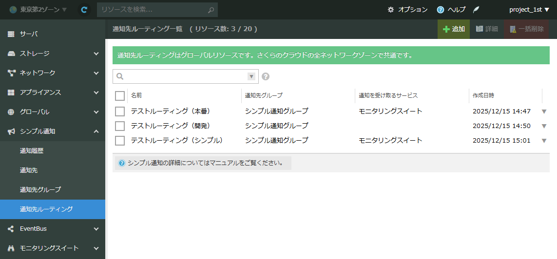さくらのクラウドの各サービスからのシンプル通知を呼び出す場合、呼び出し元を選択します。選択しない場合、通知APIを利用した通知のみ送信します ※EventBusの場合、選択する必要はありません |