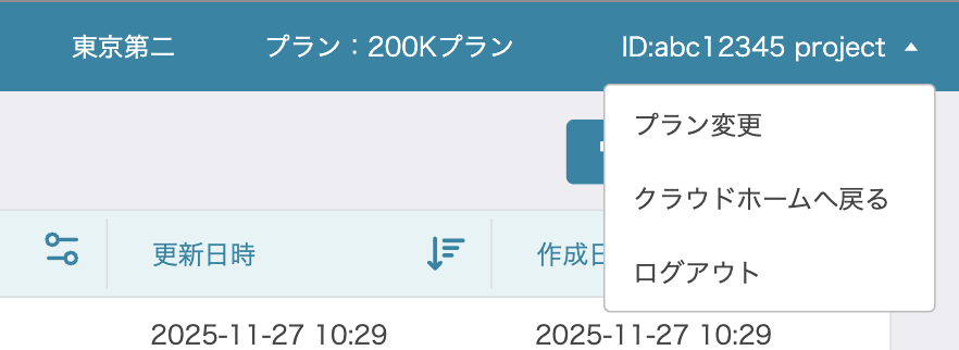 会員IDまたはプロジェクト名をクリックすると、プランの変更、クラウドホームへの移動、ログアウトができます。
