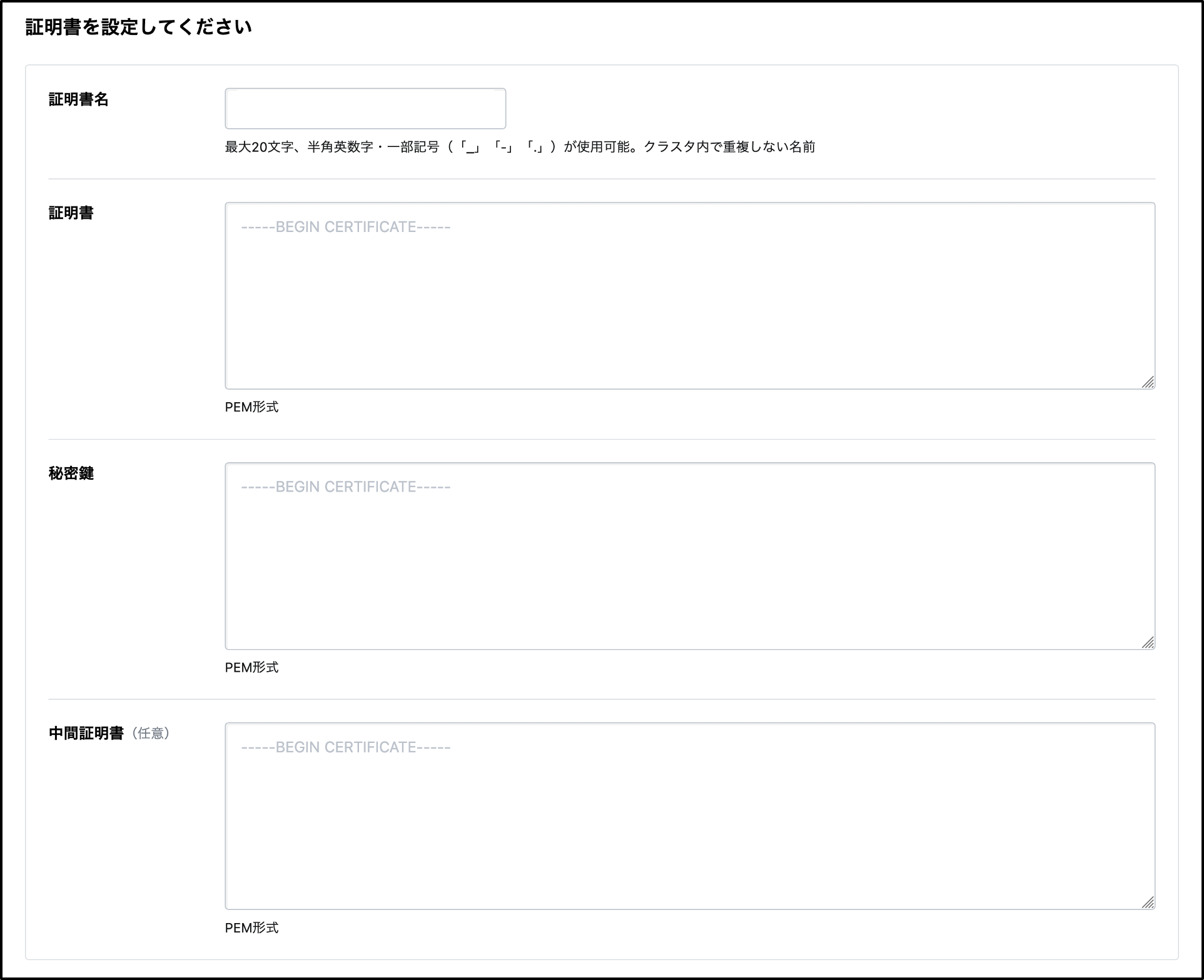 説明: 証明書の認証に使用する秘密鍵をPEM形式で記入します。
