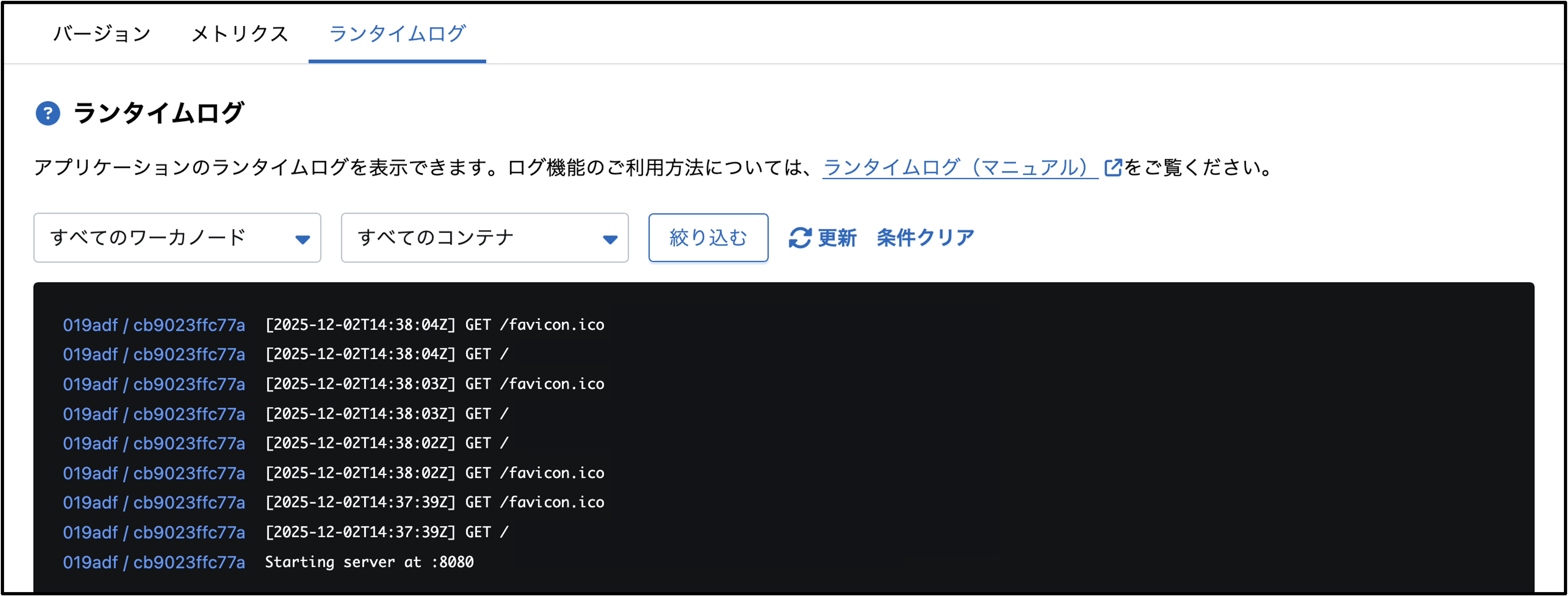 コンテナログ: 各アプリケーションバージョンのコンテナ標準出力・標準エラー