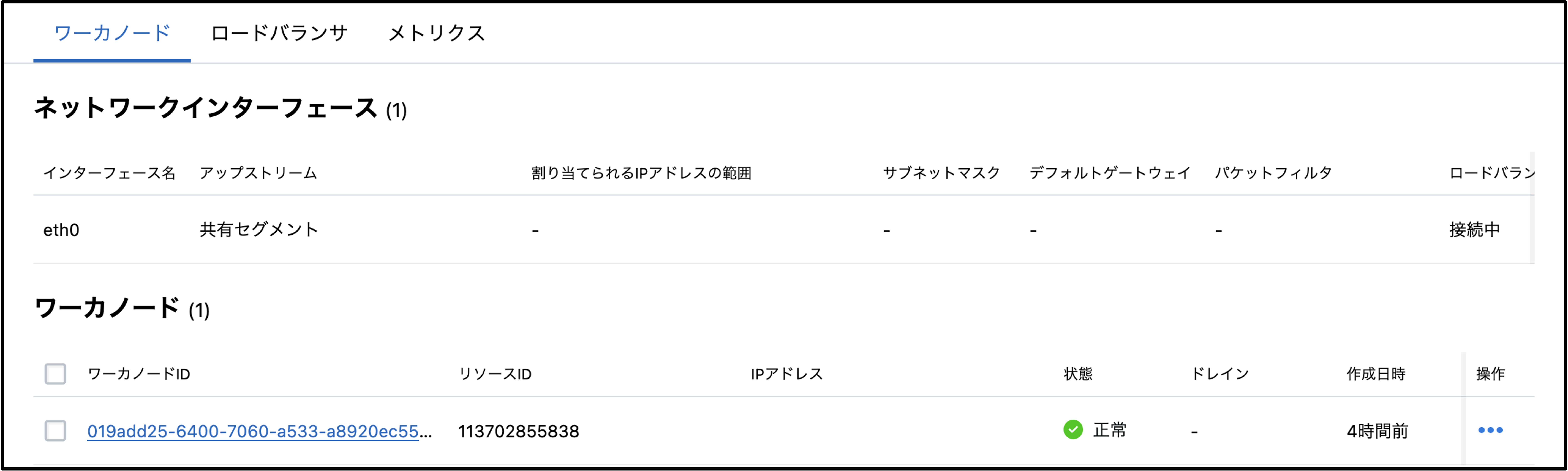 ノードメトリクス: ワーカノードまたはロードバランサノードのCPU使用率、メモリ使用量、ネットワークトラフィック、ディスクI/O