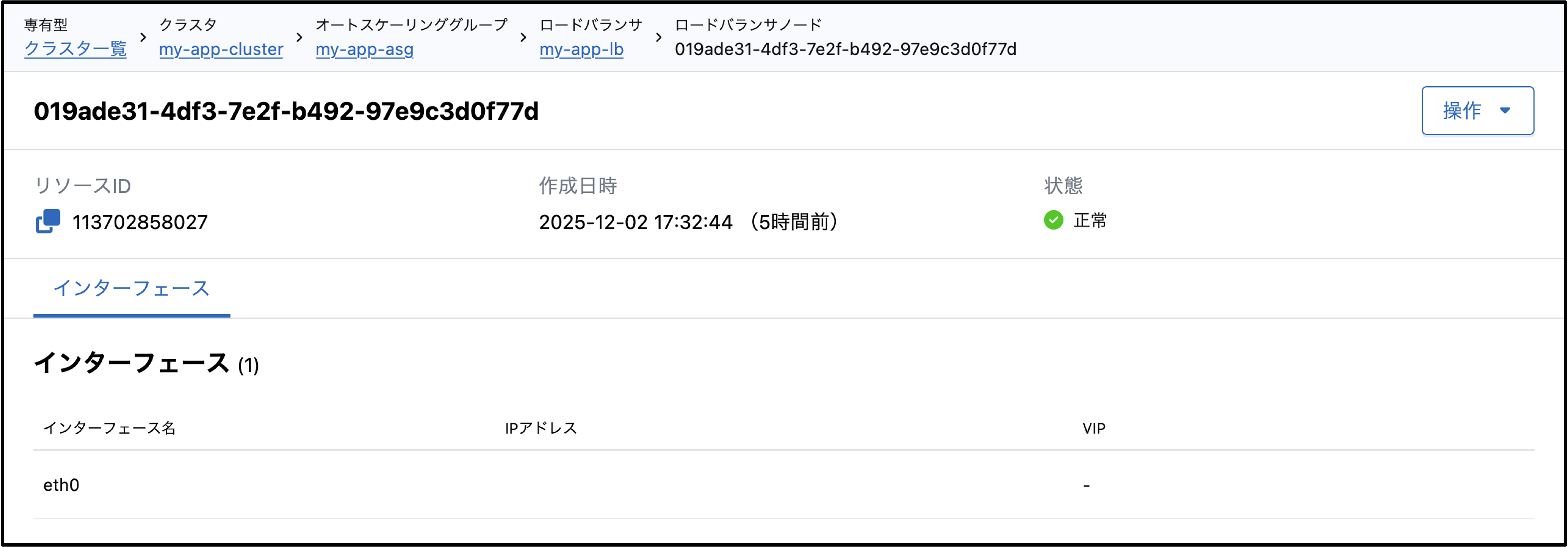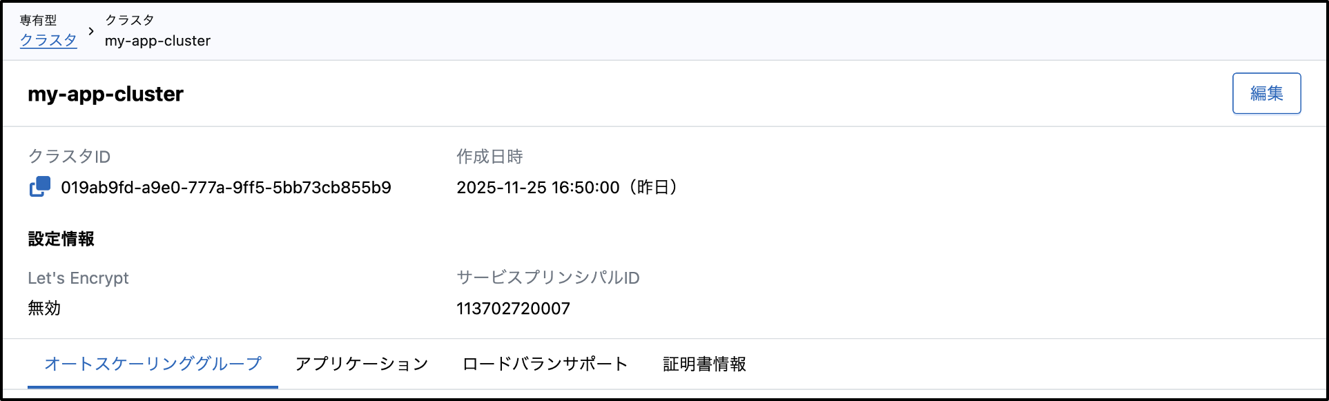 クラスタ詳細画面では、選択したクラスタの情報を確認できます。画面上部には以下が表示されます。