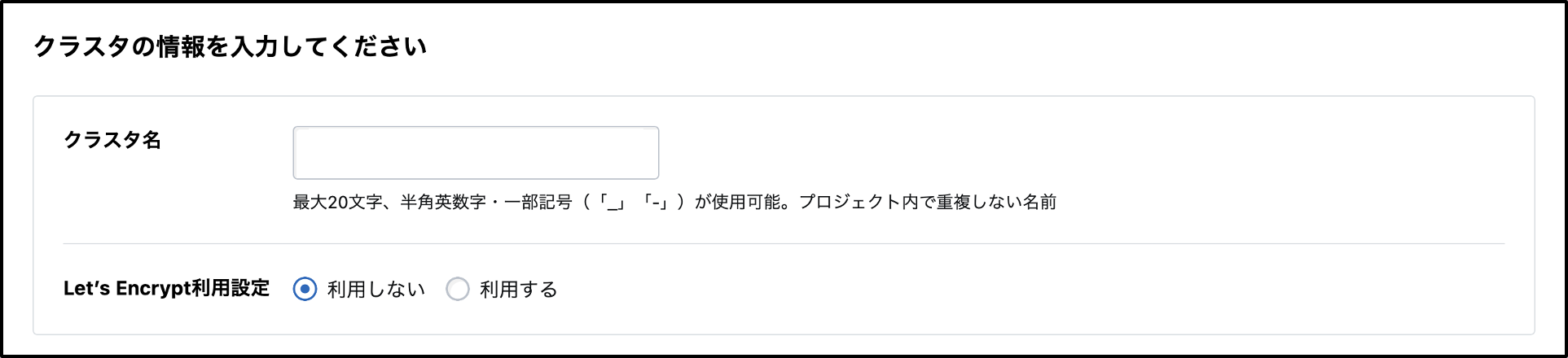 画面右上の「+クラスタを追加」ボタンから、クラスタを新規作成することができます。