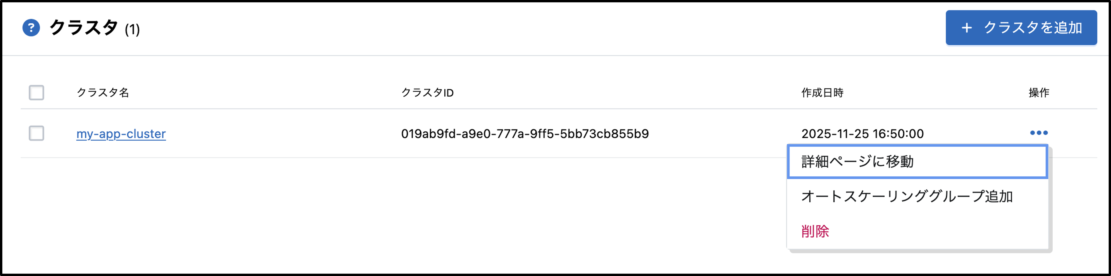 詳細ページに移動: クラスタの詳細画面へ遷移