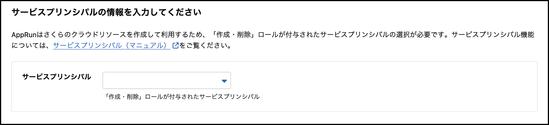 説明: さくらのクラウドリソースを作成するためのサービスプリンシパルを選択します。