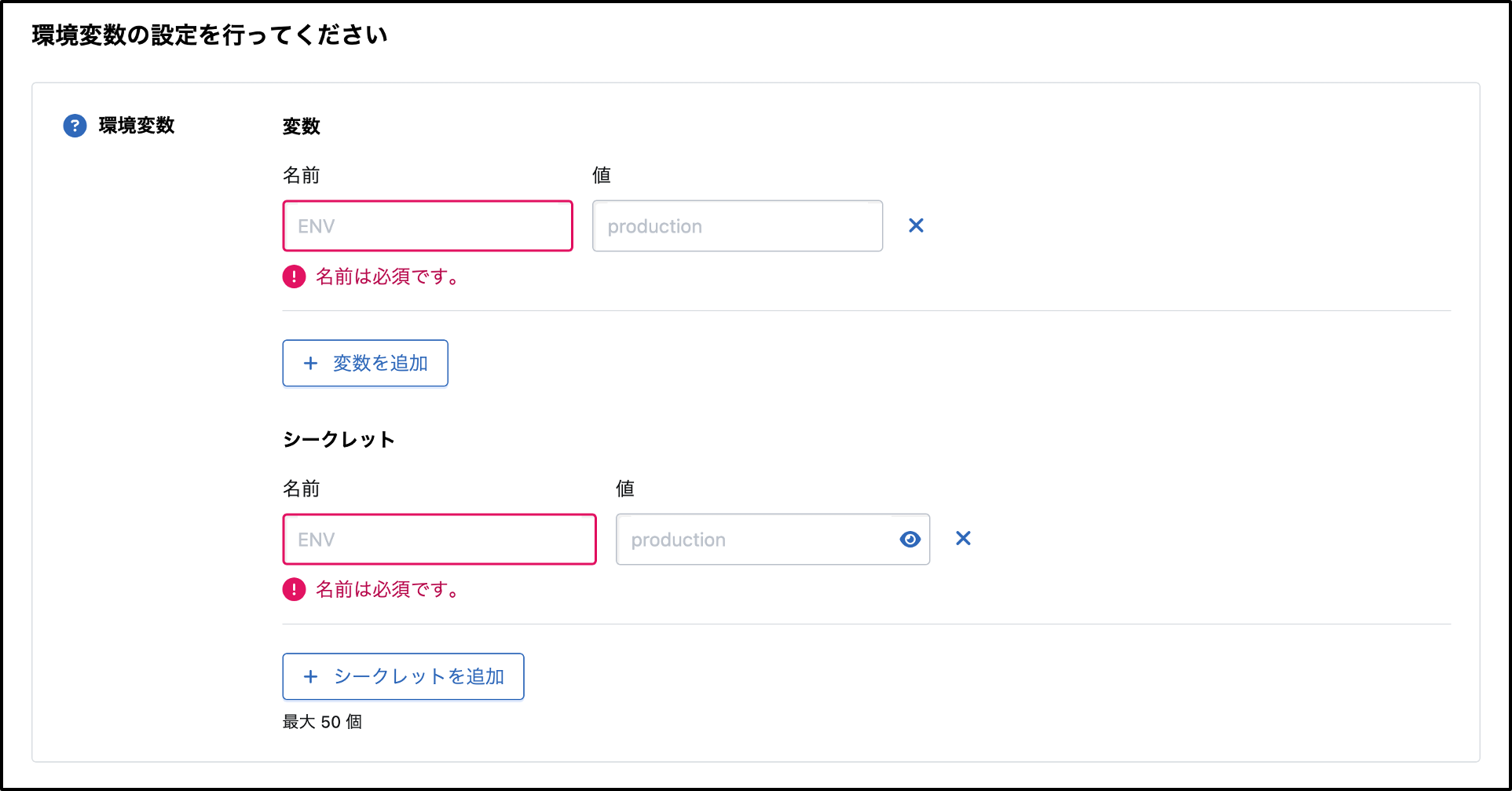説明: アプリケーション実行時に使用する環境変数の値を入力します。シークレットに環境変数を追加すると、値はマスクされてコントロールパネル上に表示されなくなります。