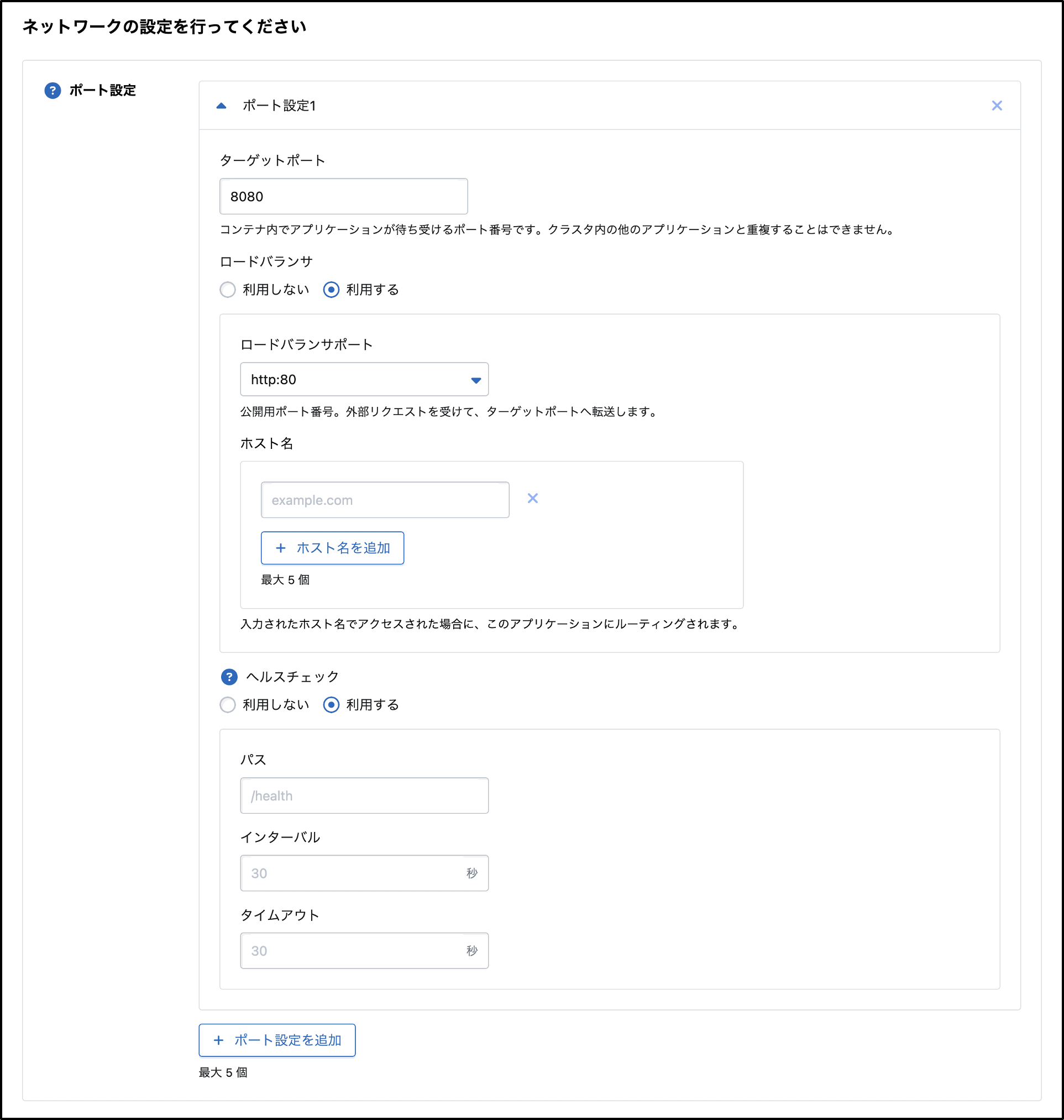 ポート設定を追加: 「+ポート設定を追加」ボタンをクリック