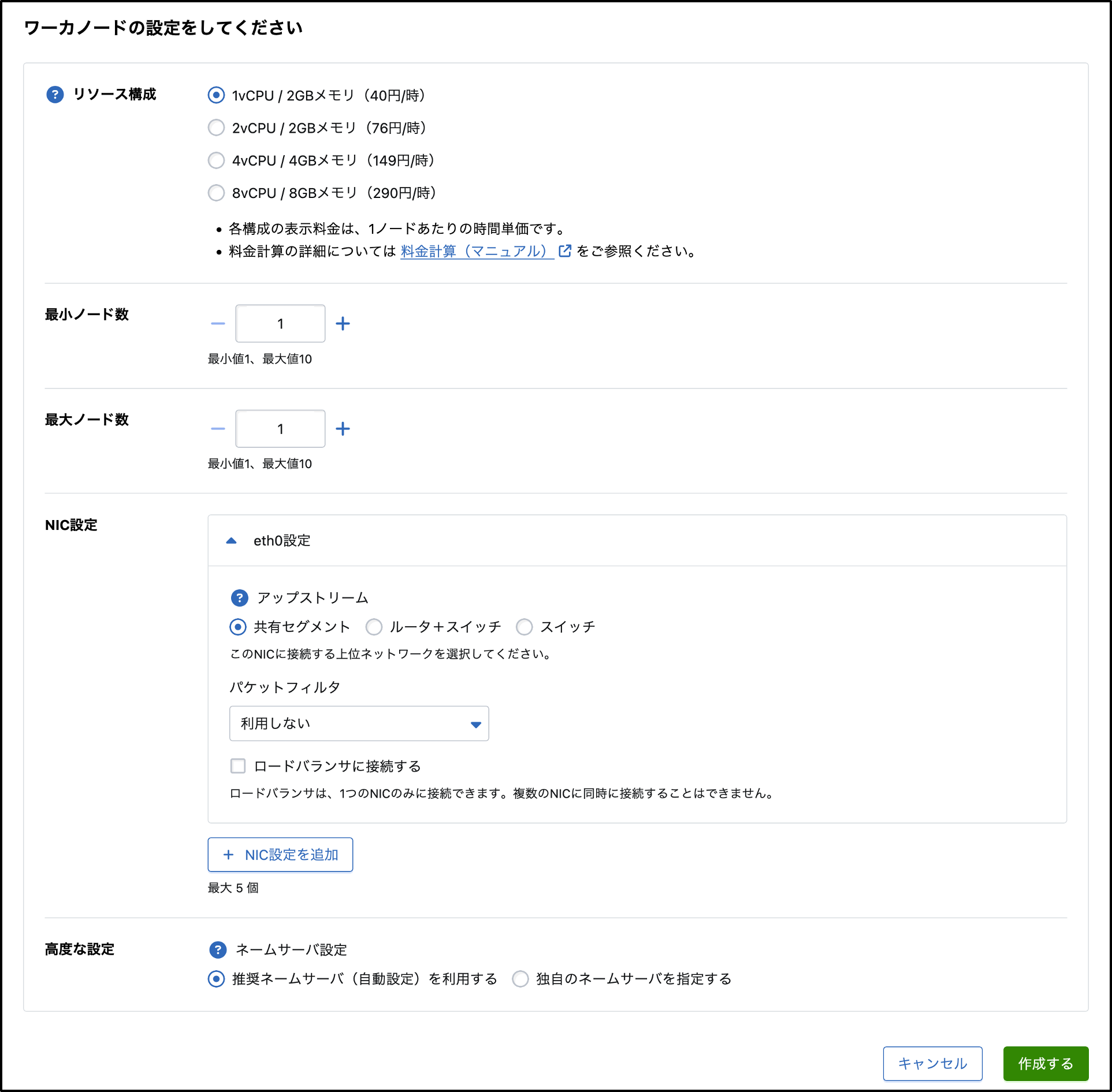 いずれの方法でも同じクラスタ作成画面が表示されます。