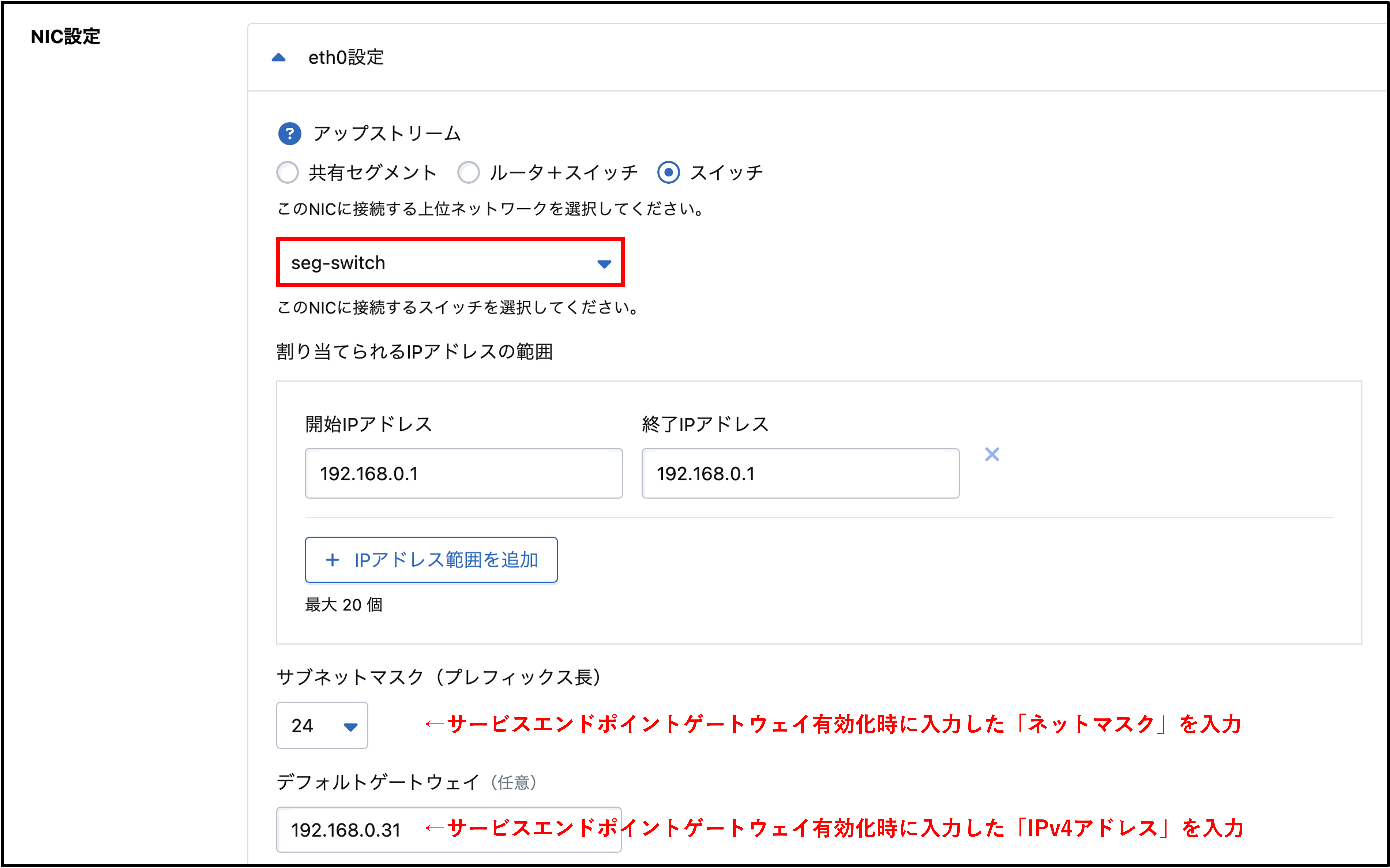 NIC設定の「アップストリーム」に、サービスエンドポイントゲートウェイが有効化された「スイッチ」を選択する必要があります