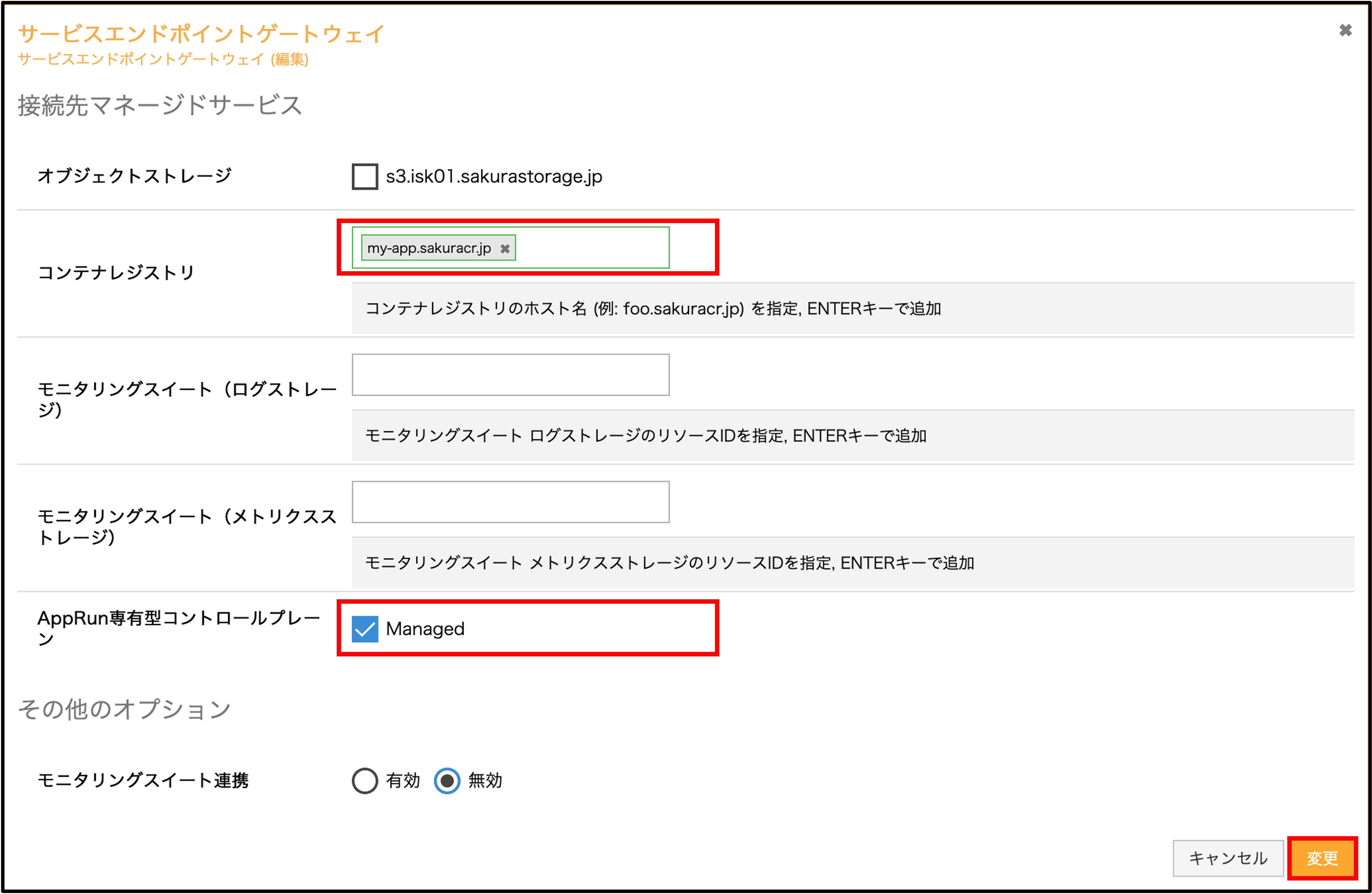 「コンテナレジストリ」欄に使用するコンテナレジストリを入力し、「AppRun専有型コントロールプレーン」の