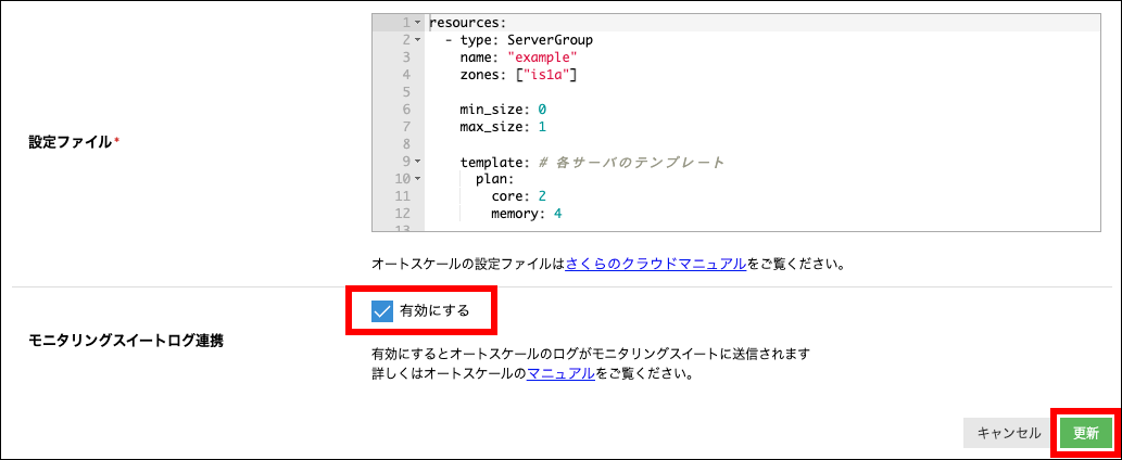 モニタリングスイートへのログの連携を有効化にするには、「オートスケールの設定の変更」をクリックし、「有効にする」にチェックを入れて「更新」ボタンをクリックします。