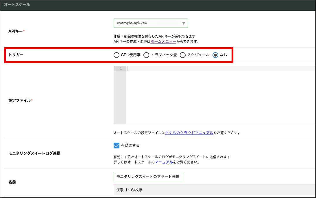 オートスケールの設定ファイルを入力します。設定例は以下をご参照ください。 |