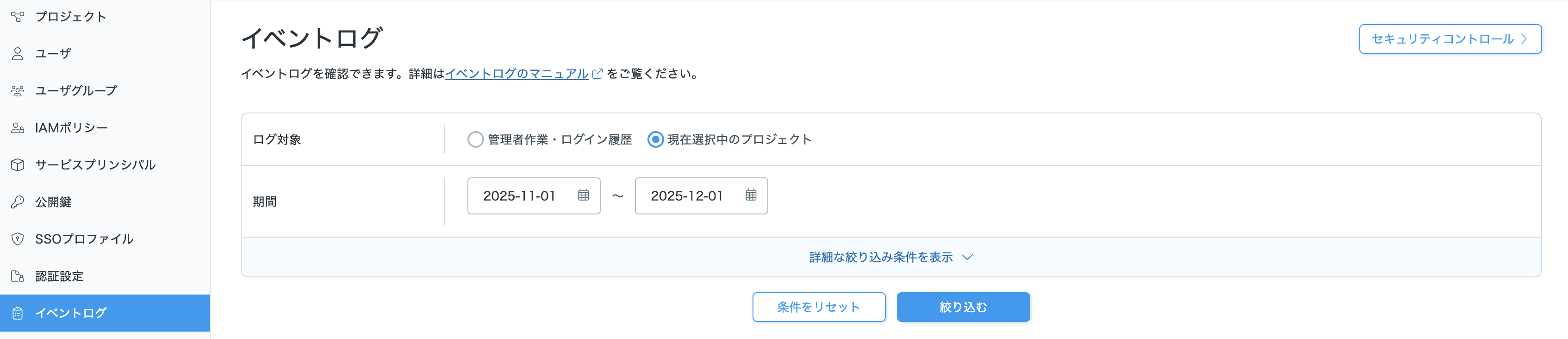 画面右上の 「セキュリティコントロール」 をクリックします。