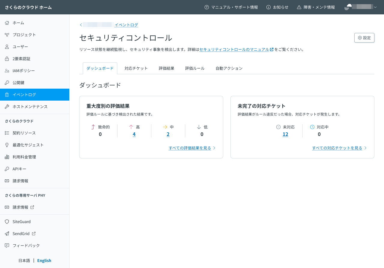 ダッシュボードは、セキュリティコントロール機能のトップ画面です。