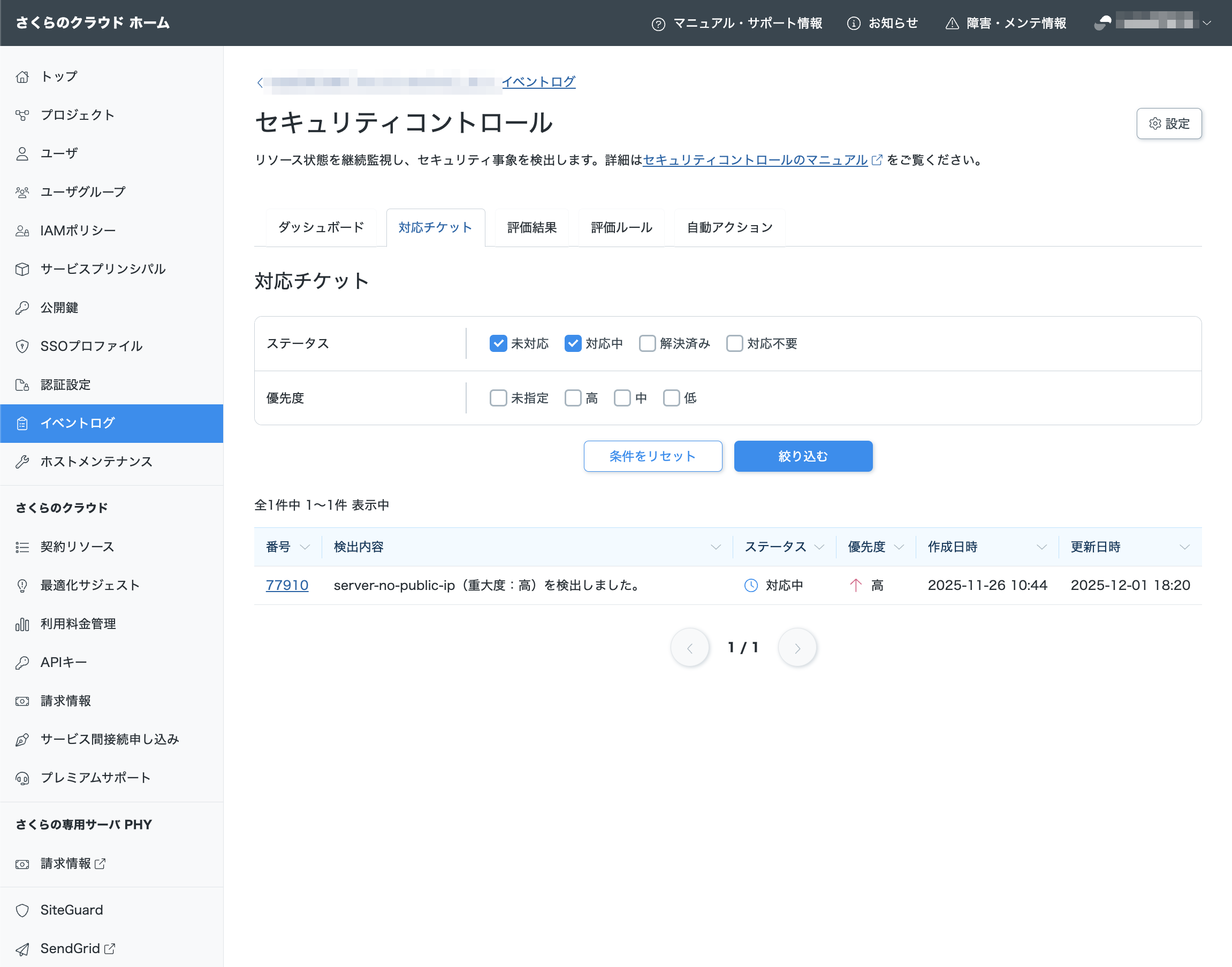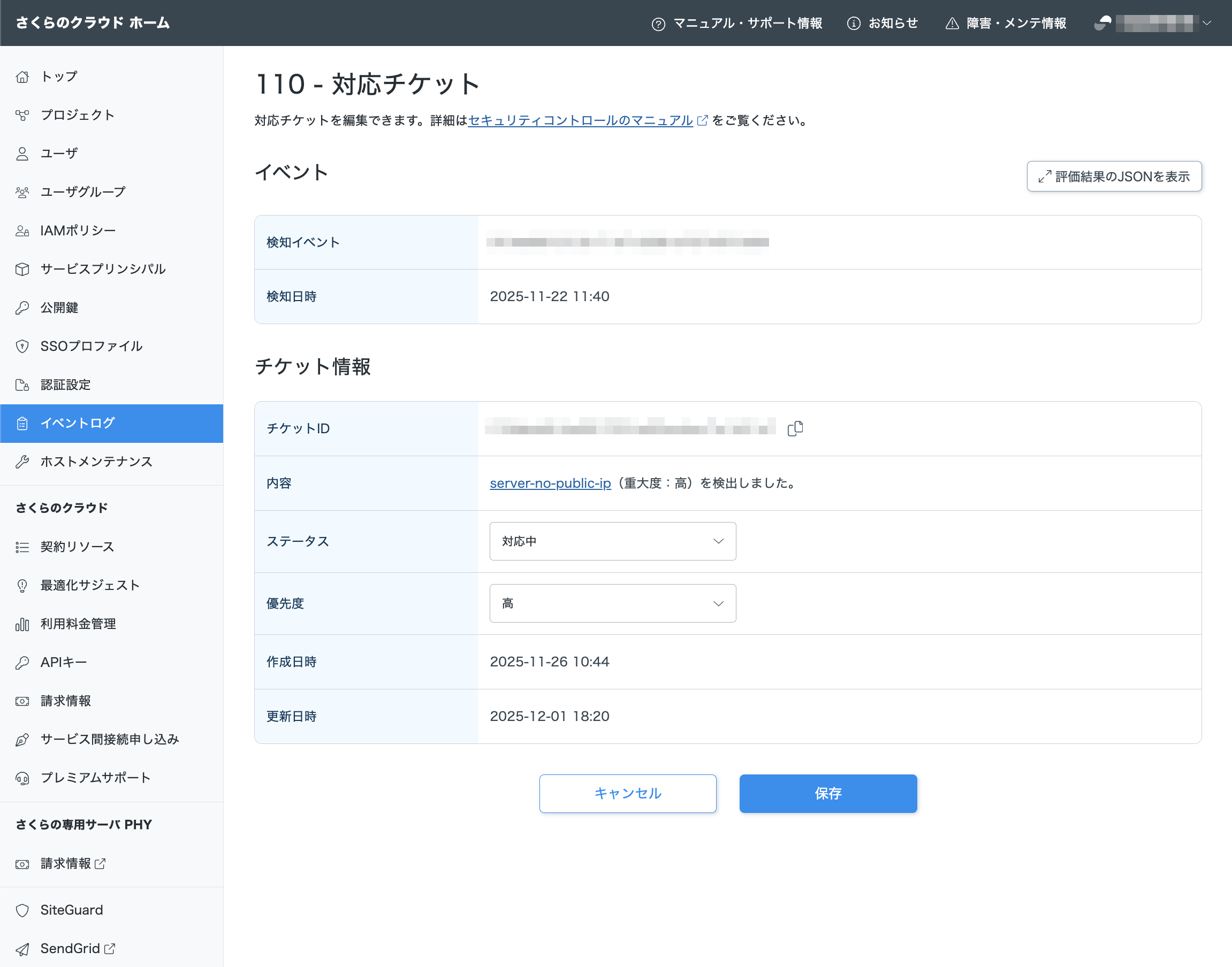 検知イベントが発生すると、自動的にチケットが作成され、対応状況を追跡できます。
