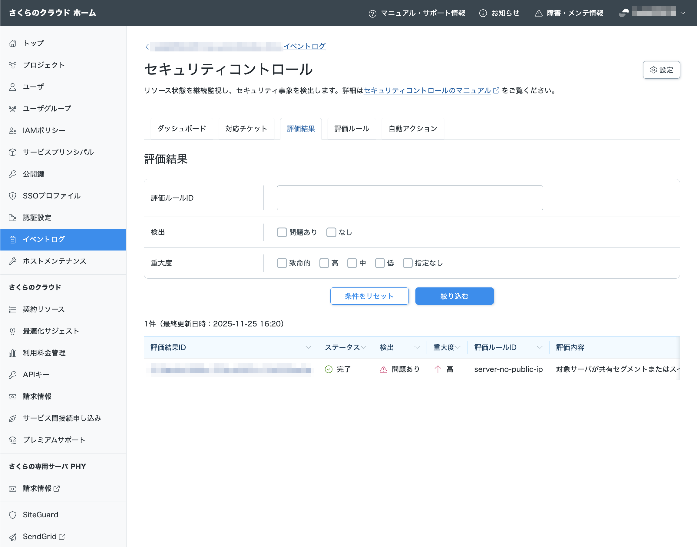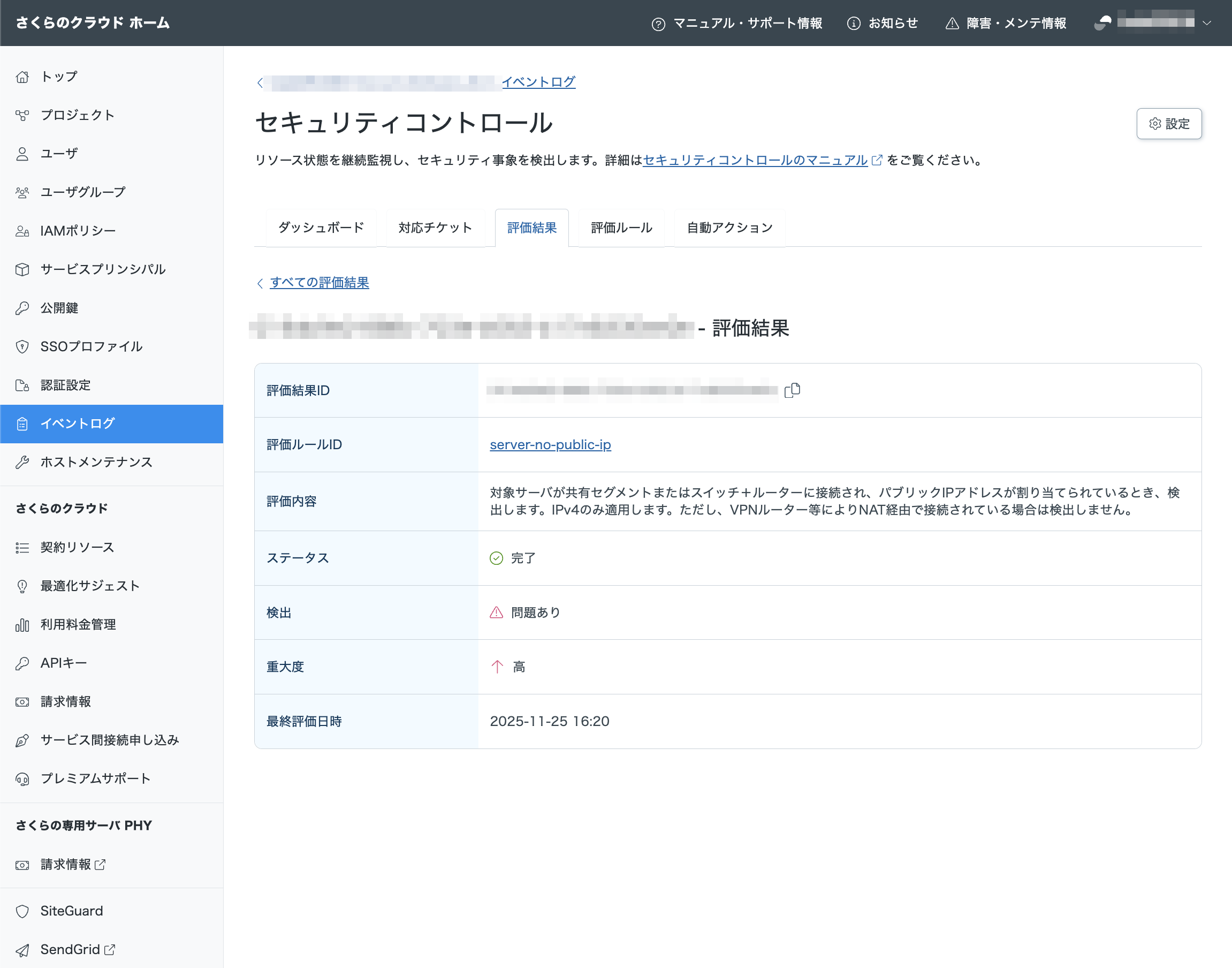 評価結果ページでは、セキュリティコントロールが実行した各評価ルールのチェック結果を一覧または詳細で確認できます。