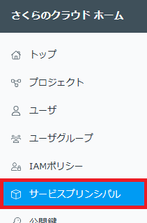 1-1. さくらのクラウドホーム画面の左メニューから「サービスプリンシパル」をクリックします。