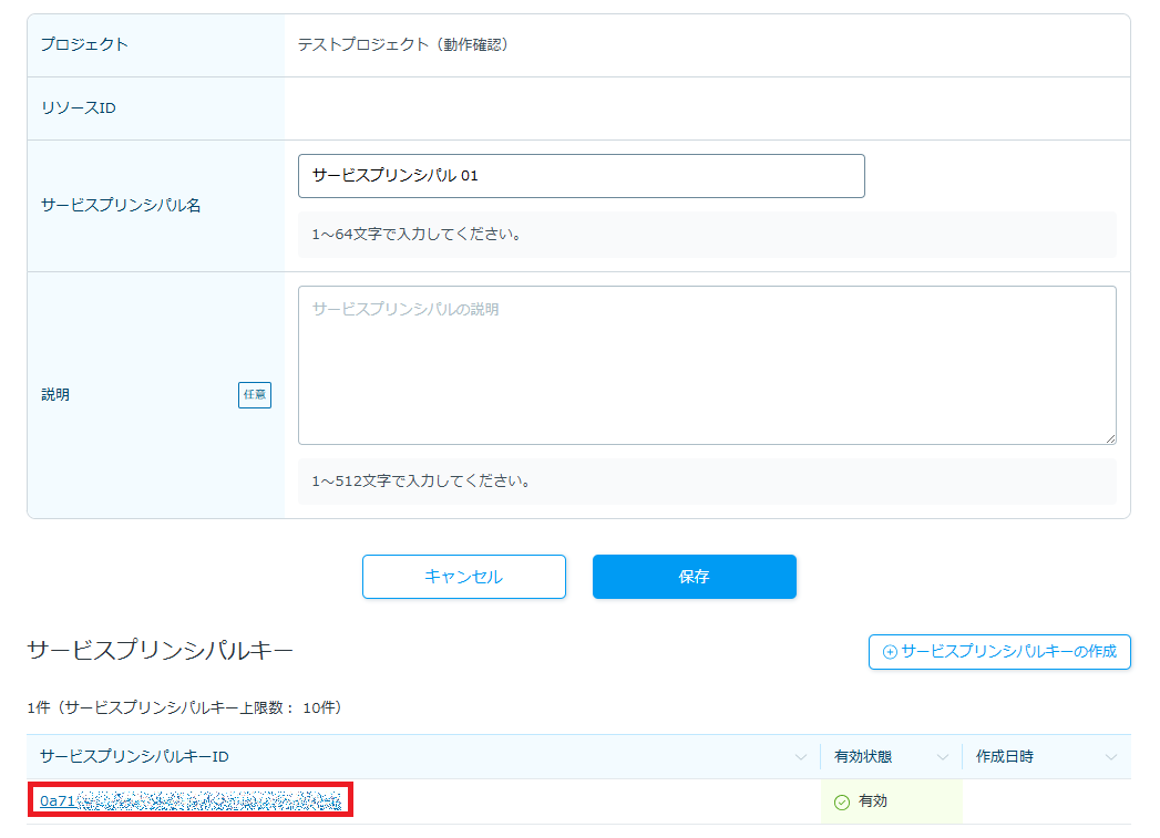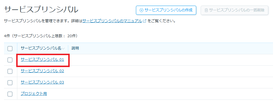 4-1. 作成されたキーの情報を確認するには、サービスプリンシパルキーの一覧画面にアクセスします。