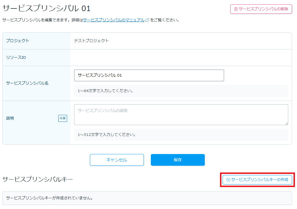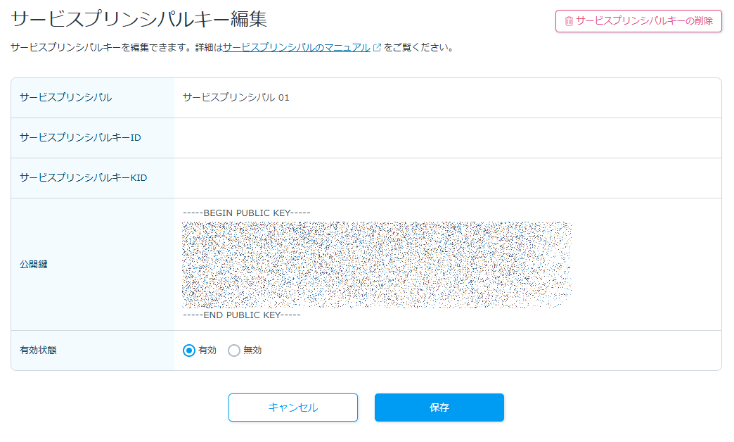 キーを削除したい場合は右上にある「サービスプリンシパルキーの削除」をクリックします。