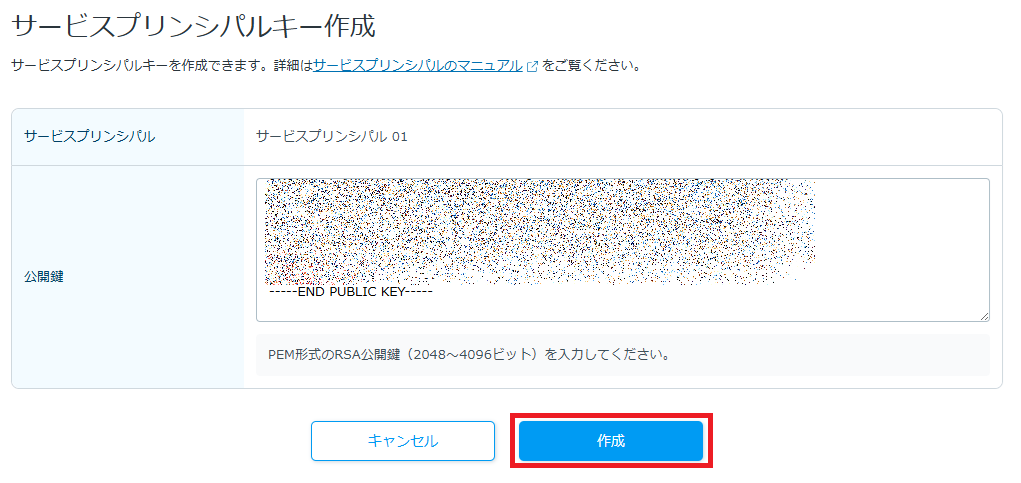 1-4. 公開鍵の情報を入力し、「作成」をクリックします。