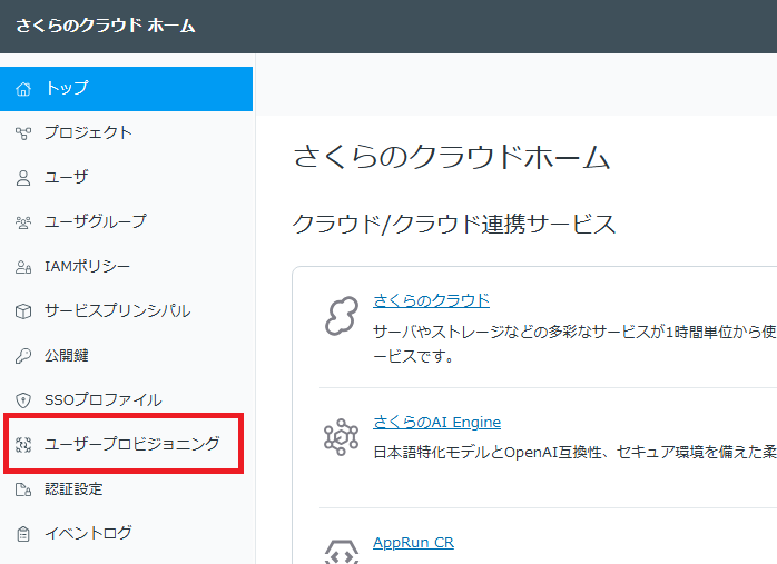 さくらのクラウドホーム画面の左メニューから「ユーザープロビジョニング」をクリックします。