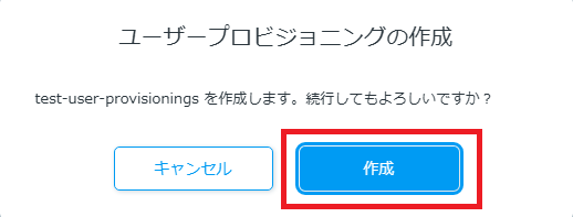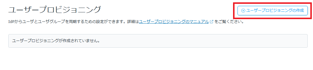 「ユーザープロビジョニング」画面が表示されるので、右上の「ユーザープロビジョニングの作成」をクリックします。