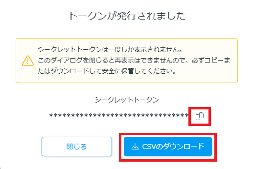シークレットトークンの情報については、設定の際に必要となります。「CSV のダウンロード」ボタンを押すか、コピーボタンを押して書き控えておきます。