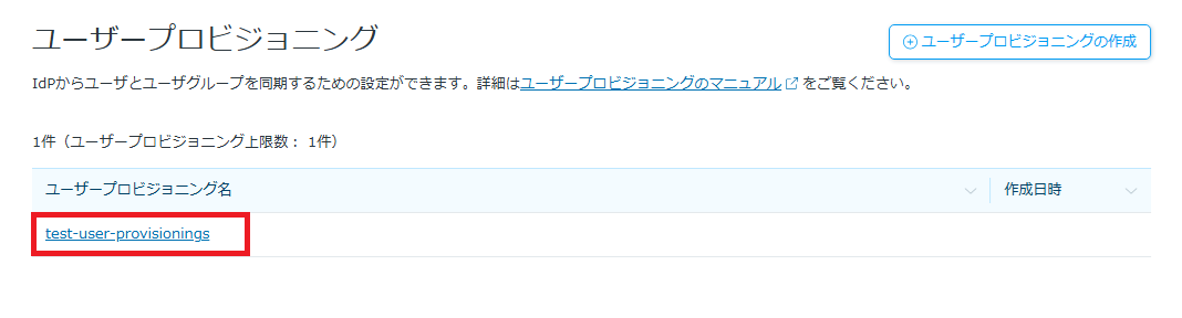 作成済みのユーザープロビジョニングの確認や削除をする場合は、一覧画面で対象のユーザープロビジョニングをクリックします。