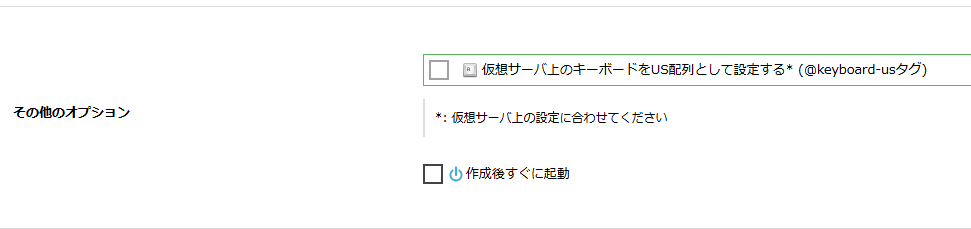 起動時のキーボードオプション(任意)、作成後の起動状態を指定します。
