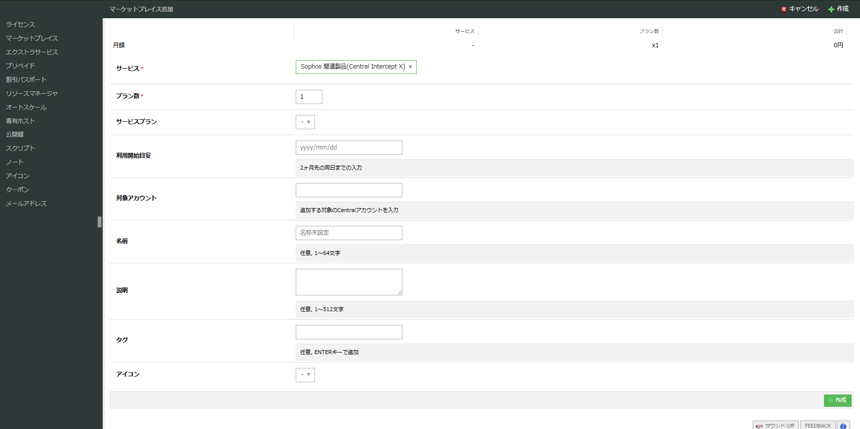 プランの申し込みは、さくらのクラウド コントロールパネル マーケットプレイス画面より申込を行います。