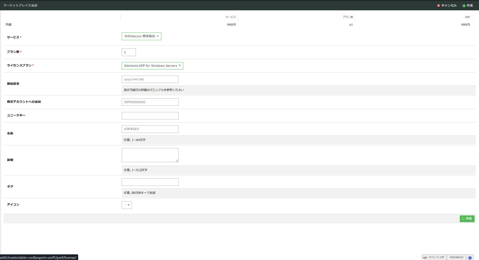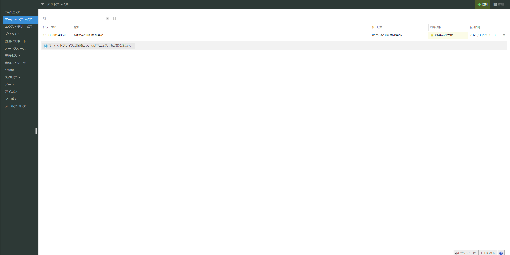 プランのお申し込みは、さくらのクラウド コントロールパネルのマーケットプレイス画面から行ってください。