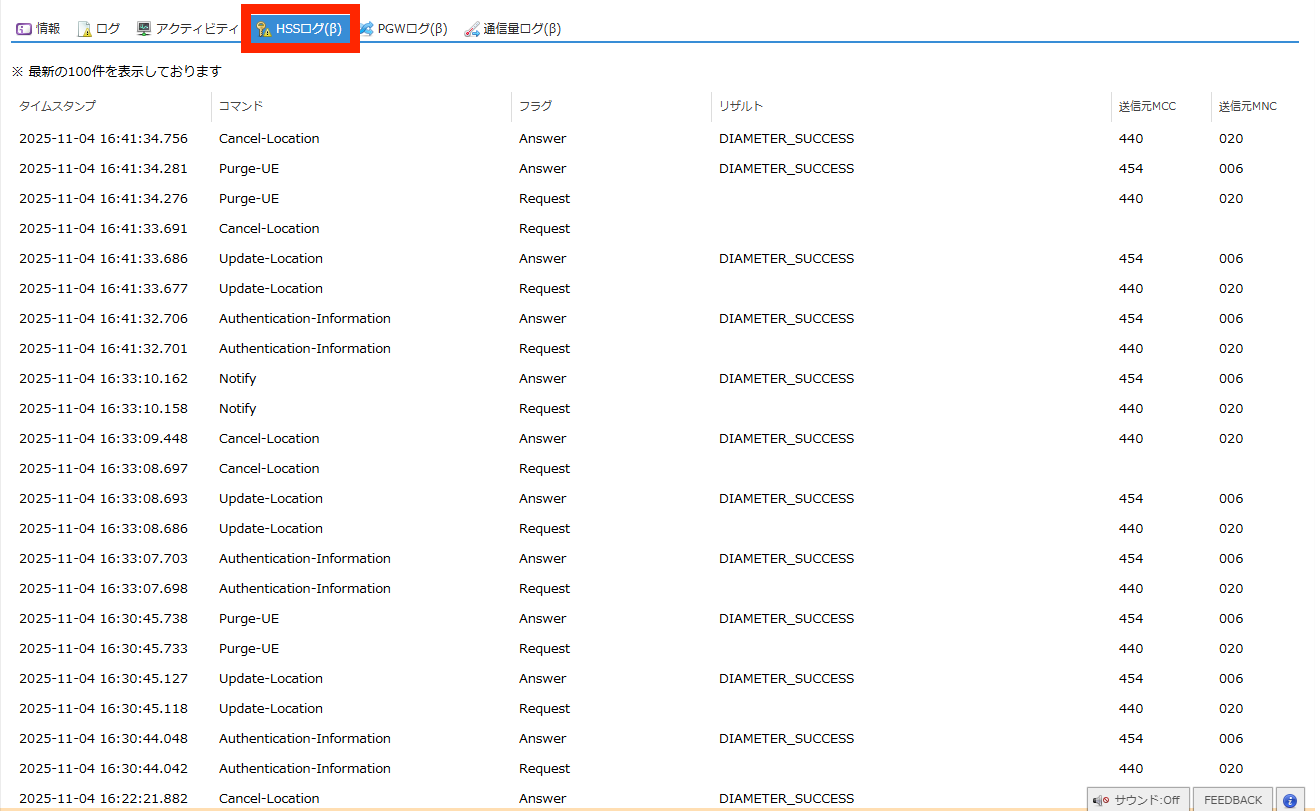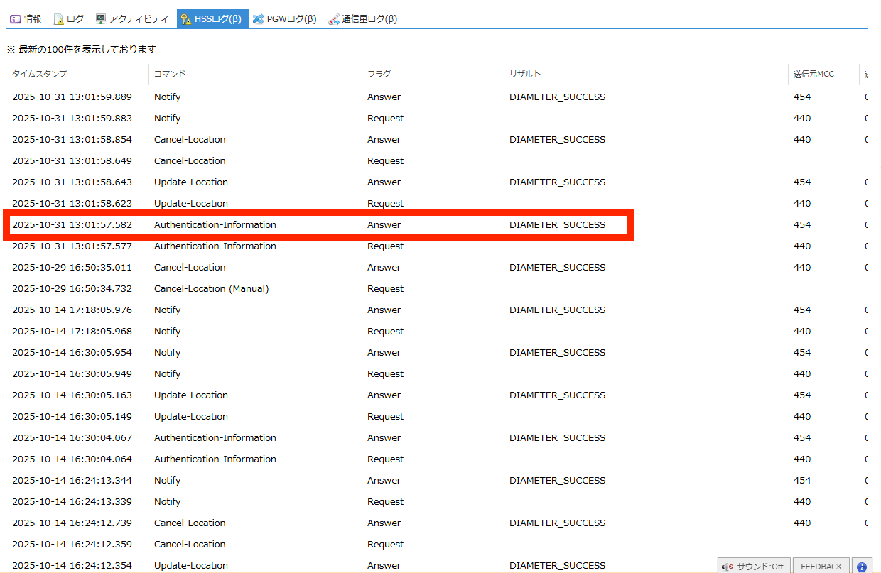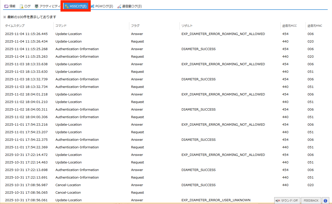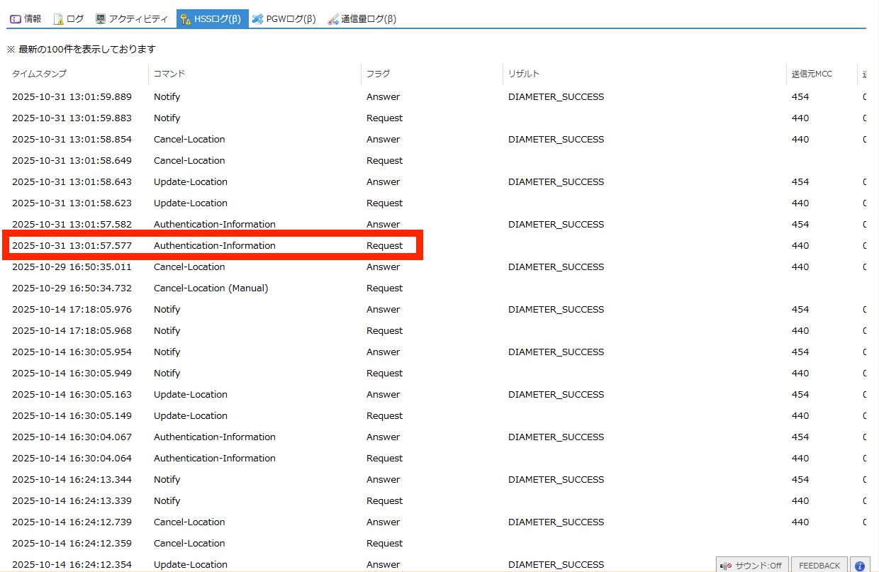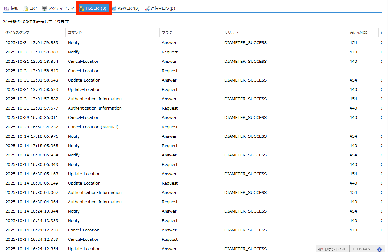 SIMの認証に関するHSS(Home Subscriber Server) のログを閲覧できます。 |