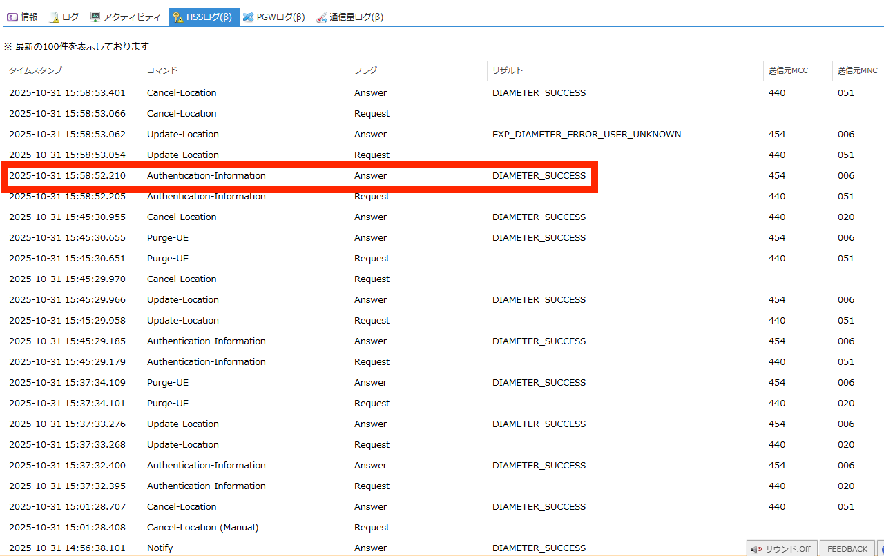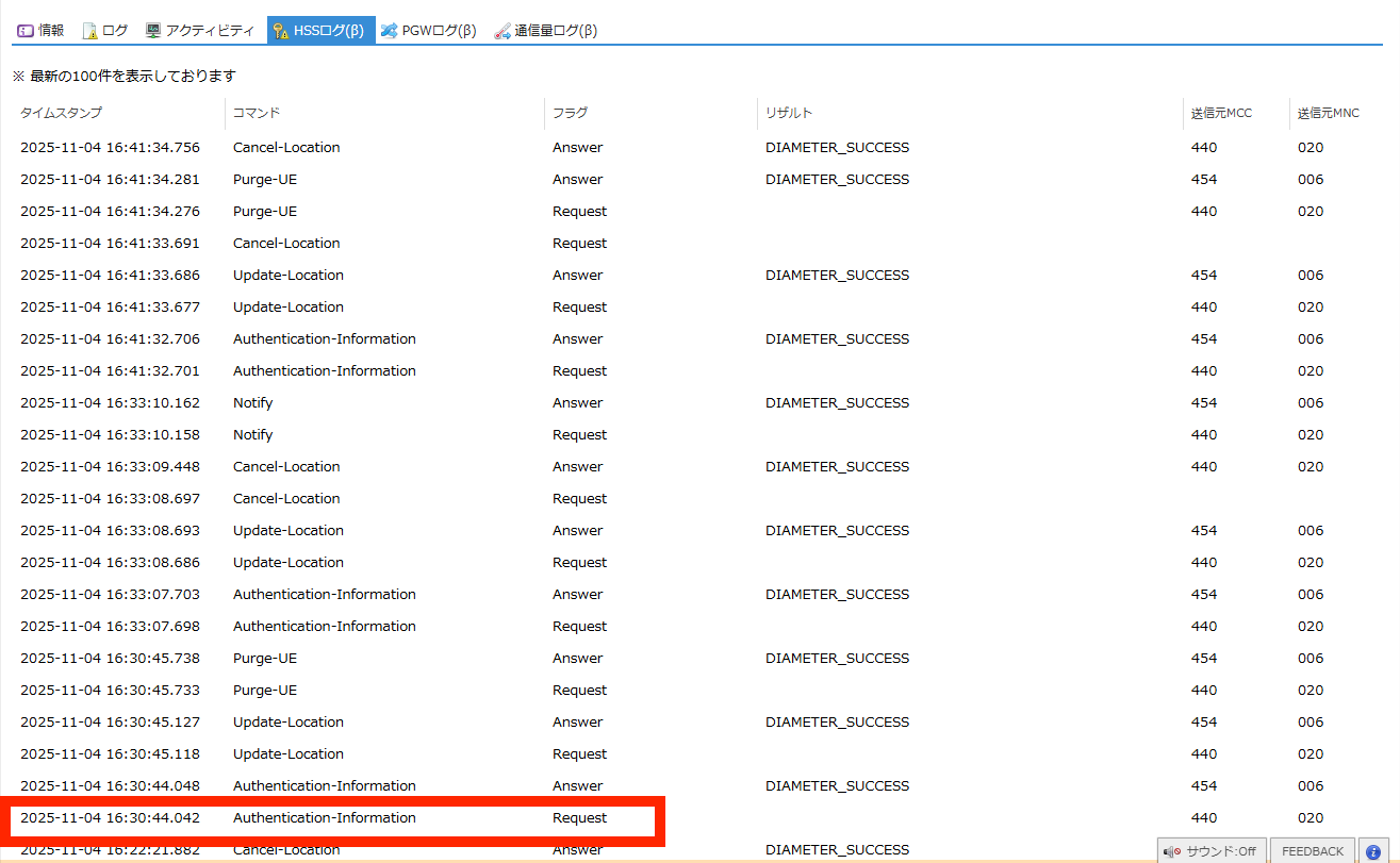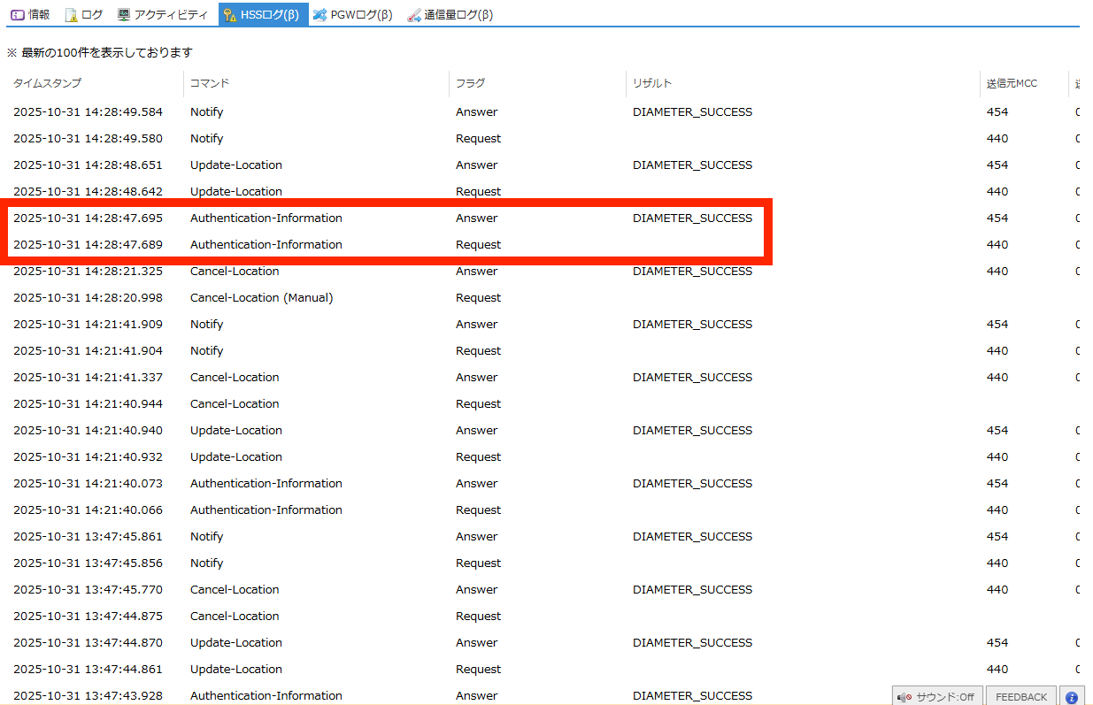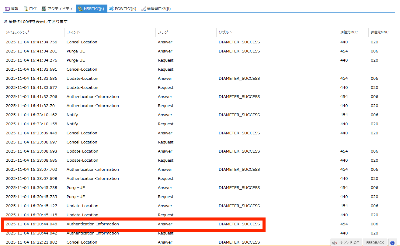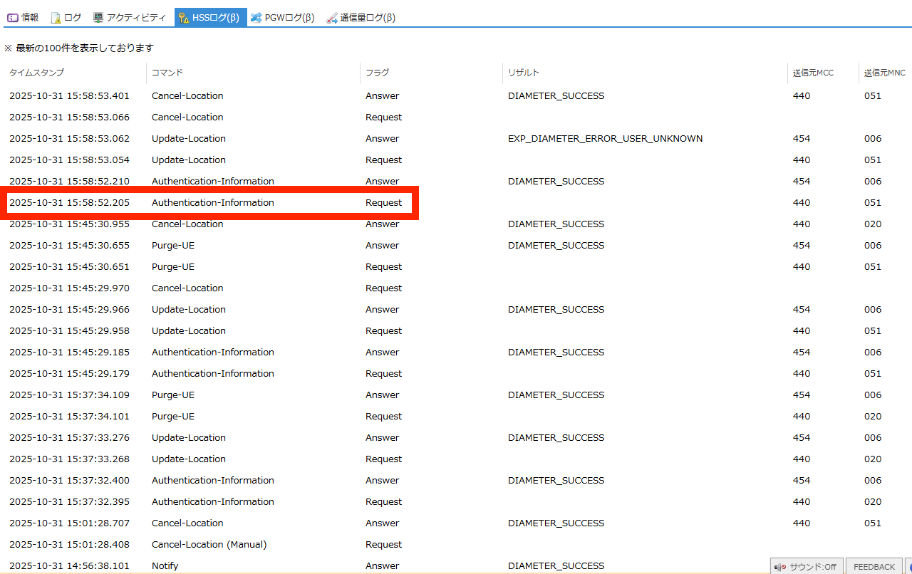 SIMの認証に関するHSS(Home Subscriber Server) のログを閲覧できます。 |