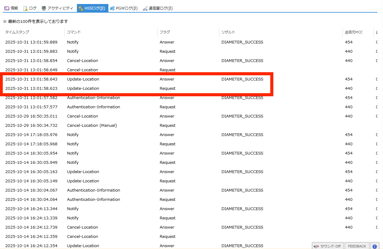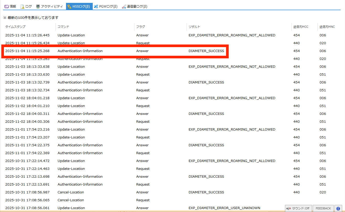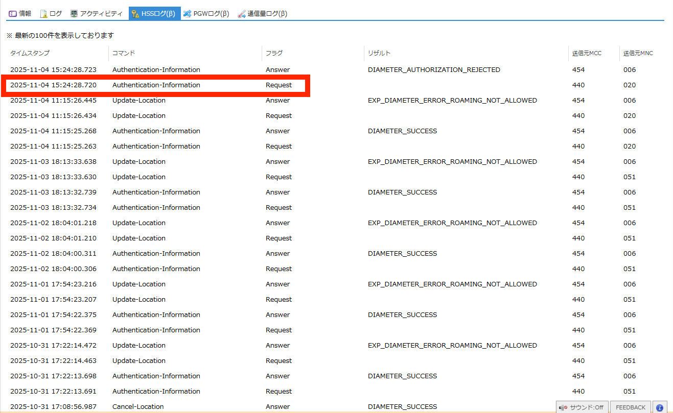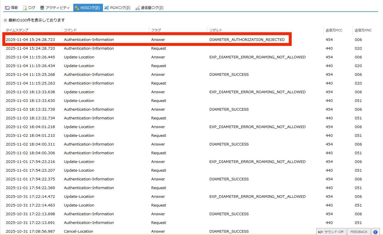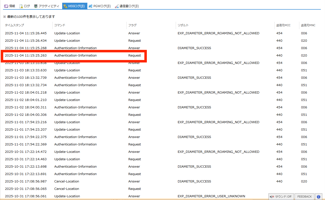 SIMの認証に関するHSS(Home Subscriber Server) のログを閲覧できます。 |