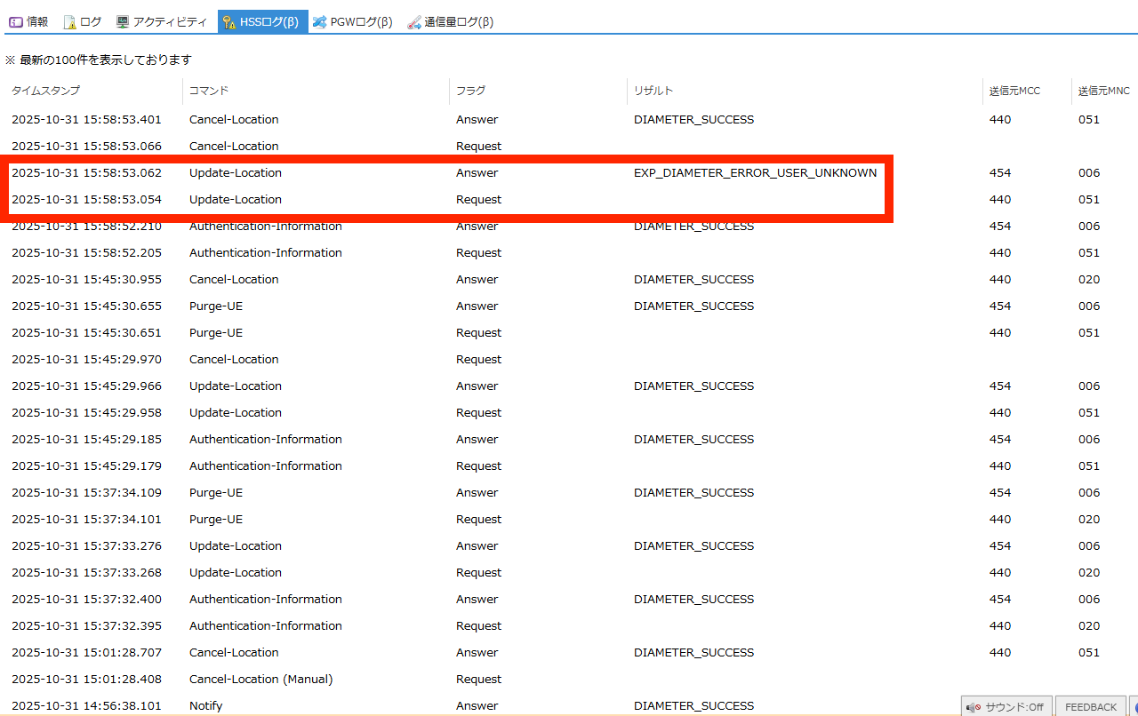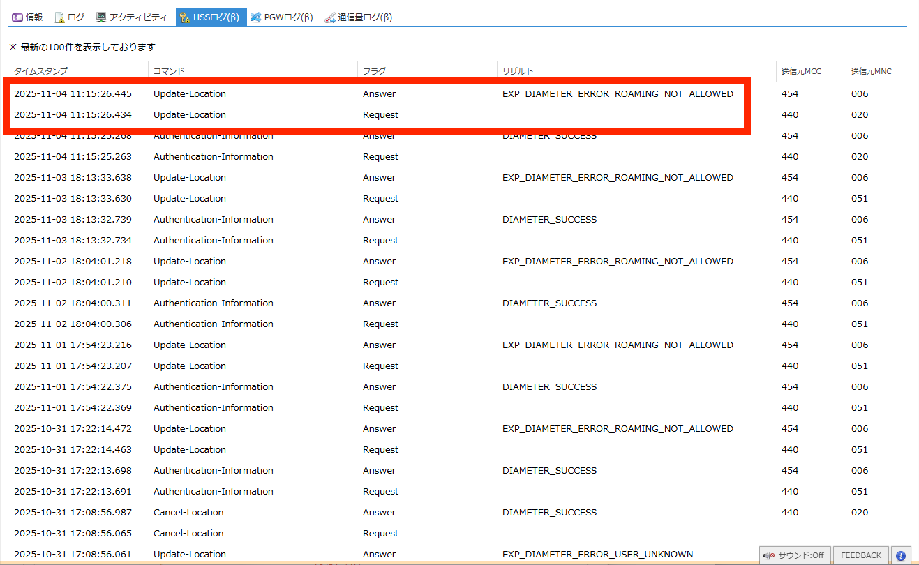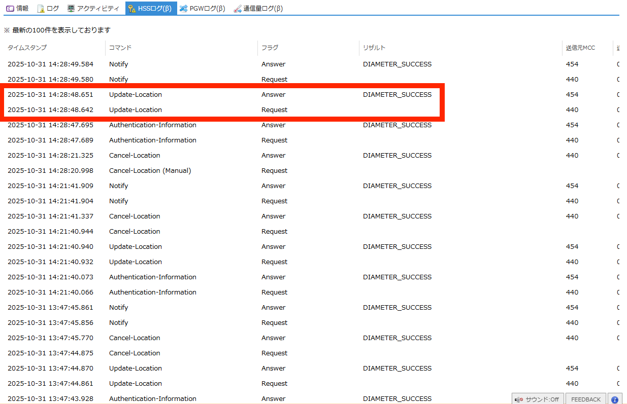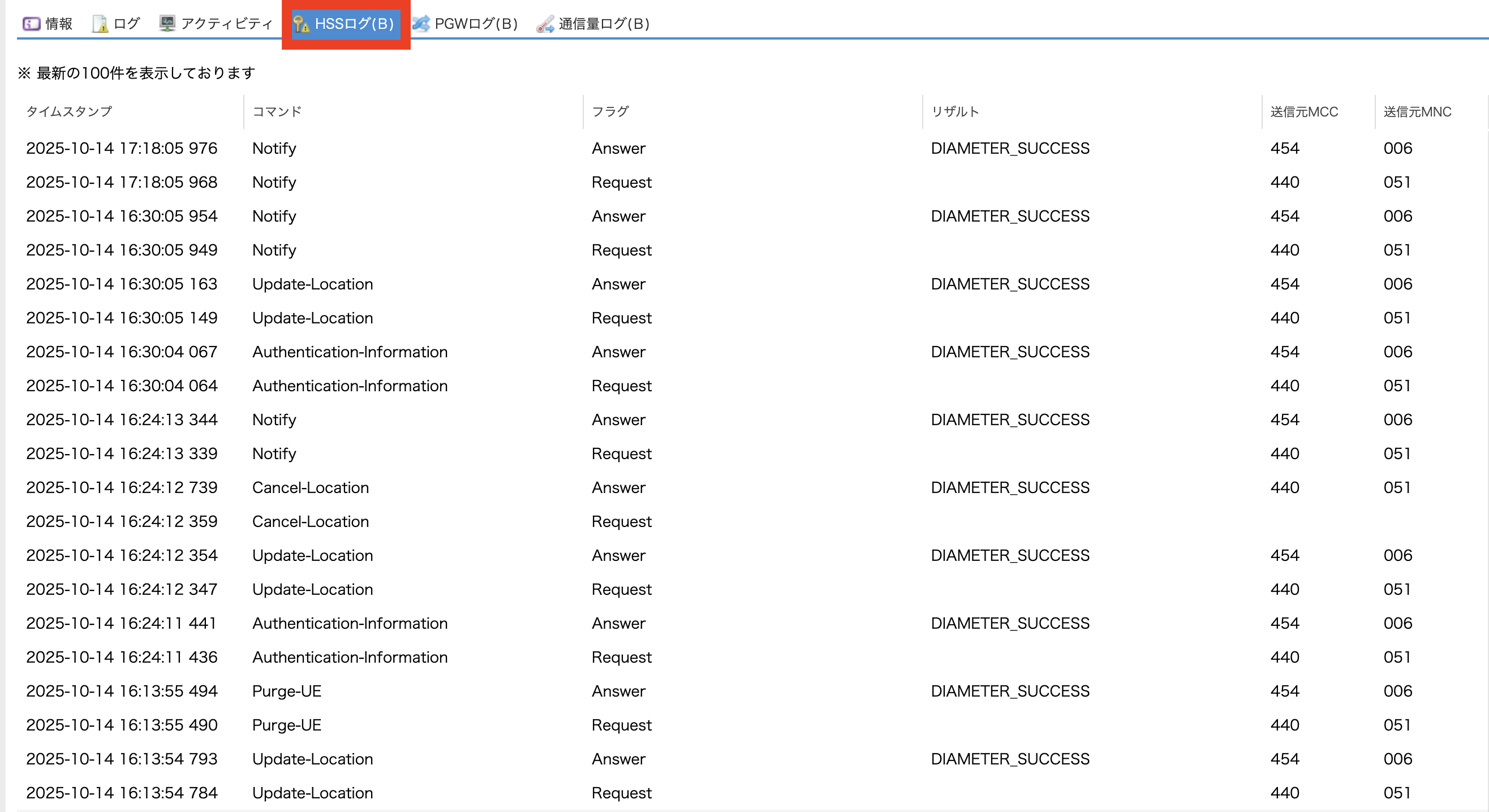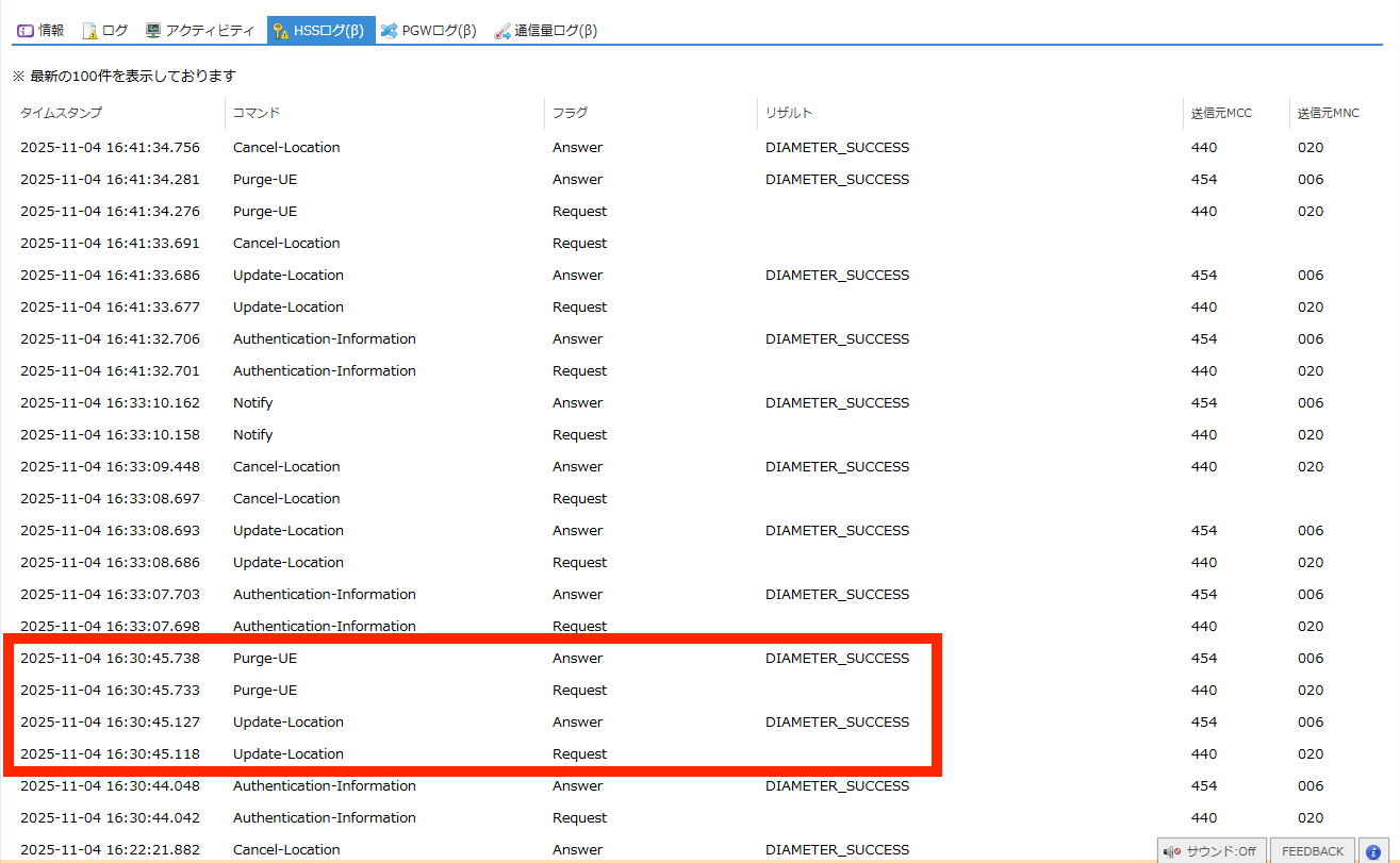 SIMの認証に関するHSS(Home Subscriber Server) のログを閲覧できます。 |